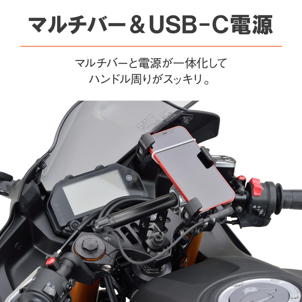 マルチバーホルダーにUSB電源が付いてハンドル周りスッキリ。マルチバーホルダーにUSB Type-Cの電源を組み込みました。ホルダースペースを有効活用できます。PREMIUM ZONEのバーエンドをイメージしたスタイリッシュなデザイン。USB PD 3.0で急速充電に対応。回転式のキャップでコネクターを水やほこりからガードします。セパレートハンドル車で見やすいセンター位置にデジモノを装着できます。【USB Type-Cコネクターで急速充電】USB PD(パワーデリバリー)対応で最大18W(5V/3A、9V/2A、12V/1.5A)出力可能。【ブレーキスイッチに接続するだけのカンタン接続】メインキー連動でバッテリー上がりの心配なし。ブレーキスイッチとフレームのボルトに共締めするだけの簡単取り付け。【USB電源とマルチバーホルダーが一体化】クランプスペースを確保しつつ、電源が内蔵されることでハンドル周りがスッキリ。USB Type-C 急速充電対応(USB PD3.0対応/最大18W)ブレーキスイッチに接続するだけのカンタン取付ステムホールが空いたセパレートハンドル車用別売のマウントキットと併用して取り付け。ステムホール径φ13-14(95444)、φ15-17(95442)、φ17-20(95443)に対応パイプ径φ22. 2/全長155mm/高さ64.3mm※下記車両にはご利用できません。・ステムホールが無い・ステムホールの穴径が合わない・ハンドルポスト付車・ステムホール付近に障害物があり、ハンドルを切った際にホールをふさいでしまう