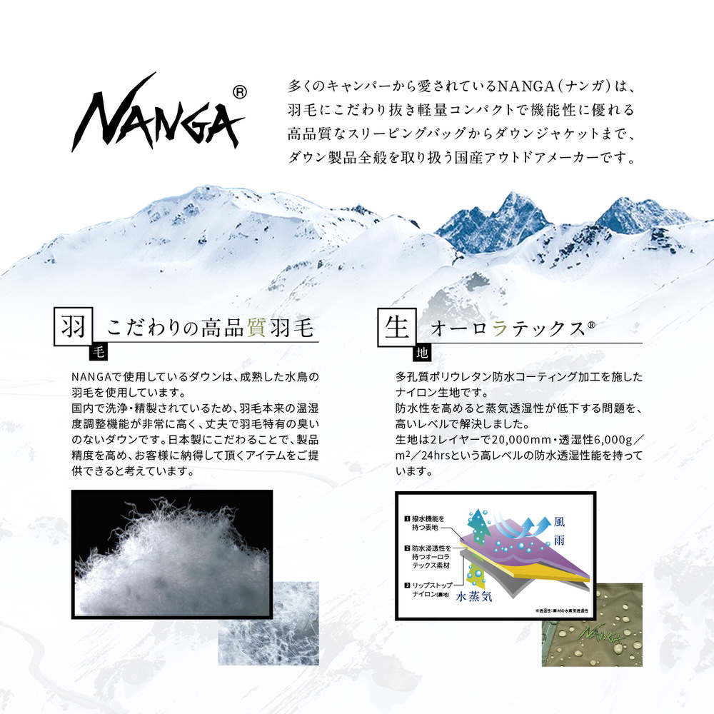 冬のライダーに、お洒落を。NANGA独自の防水透湿素材オーロラテックスを採用した、NANGAのフラッグシップモデル「AURORA Down Jacket」のデイトナ特別モデルです。メインジップをはじめ、ポケット類は全て止水ジップを使用。ポケットの内側には起毛素材、袖口はヌバックタイプのベルクロを取り付け、冷気の侵入を遮断。ジャケットの内側にはやわらかな生地を採用することで、羽毛が膨らみやすくなり、着用時の保温性やフィット感を高めます。少し大きめなシルエットと、ラグランスリーブを採用することで、冬場の厚い衣服の上から着用しても窮屈さを感じさせません。