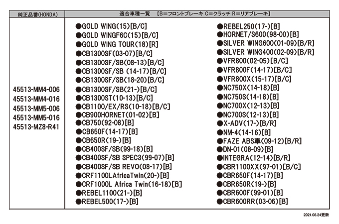適合:下記ホンダ純正品番が使用されている車両に適合します。45513-MM4-006、45513-MM4-016、45513-MM5-006、45513-MM5-016、45513-MZ8-R41※ブレーキ側、クラッチ側 共通素材・仕様:・アルミ合金・MC切削ロゴ