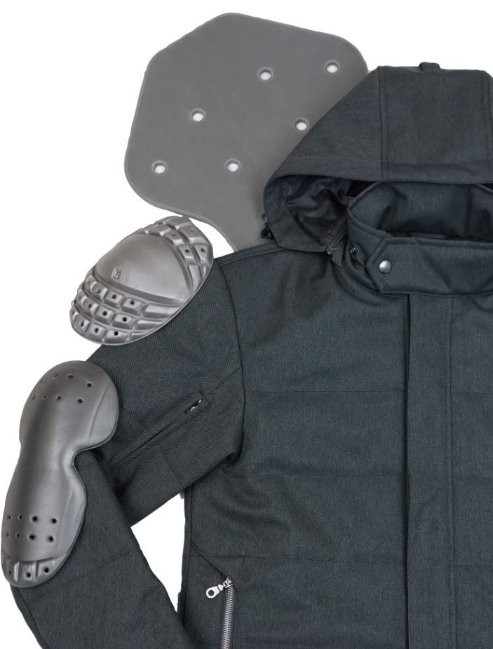 ダウンに匹敵する高機能素材、プリマロフトの中綿入りパーカー。中綿には超軽量・イージーメンテナンス性を兼ね備えた最高クラスの保温力を誇る「PrimaLoft Gold Insulation with Cross Core 」(プリマロフト・ゴールド・インサレーション・ウィズ・クロス・コア)を採用し最高の防寒性を誇ります。プリマロフトは、羽毛に代わる画企的な超微細マイクロファイバー素材で、羽毛のように軽くて暖かい保温性と柔軟性を発揮するだけではなく、羽毛にはない撥水性を備えており水にも強い機能性(メンテナンス性・断熱性・防寒テクノロジー)と、過酷な環境でも使える高い実用性を備えた先進の人工中綿です。表地の質感の高いヘリンボーン素材で、やわらかく防風仕様で外気を遮断します。暖かすぎた時のためのベンチレーションも備え、衣服内温度が調整可能で快適なライディングに対応。ライディングウエアとしてはもちろん、お洒落なアーバンデザインで街着としても気軽に羽織って出かけられるフットワークの軽さで、行動範囲が広がります。MATERIAL:表地/ヘリンボーンデュアルテックス加工(ポリエステル、ナイロン、TPUボンディング)裏地/ボア(ポリエステル)、タフタ(ナイロン)中綿/プリマロフト(ポリエステル)PROTECTOR: 肩・肘・脊椎パッドOPTION:胸パッド