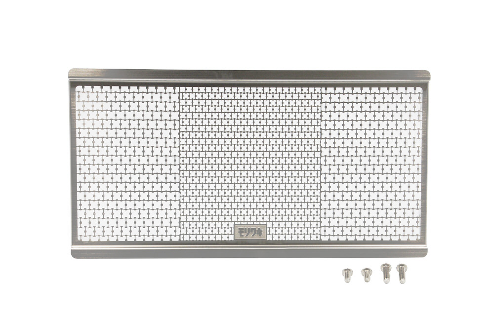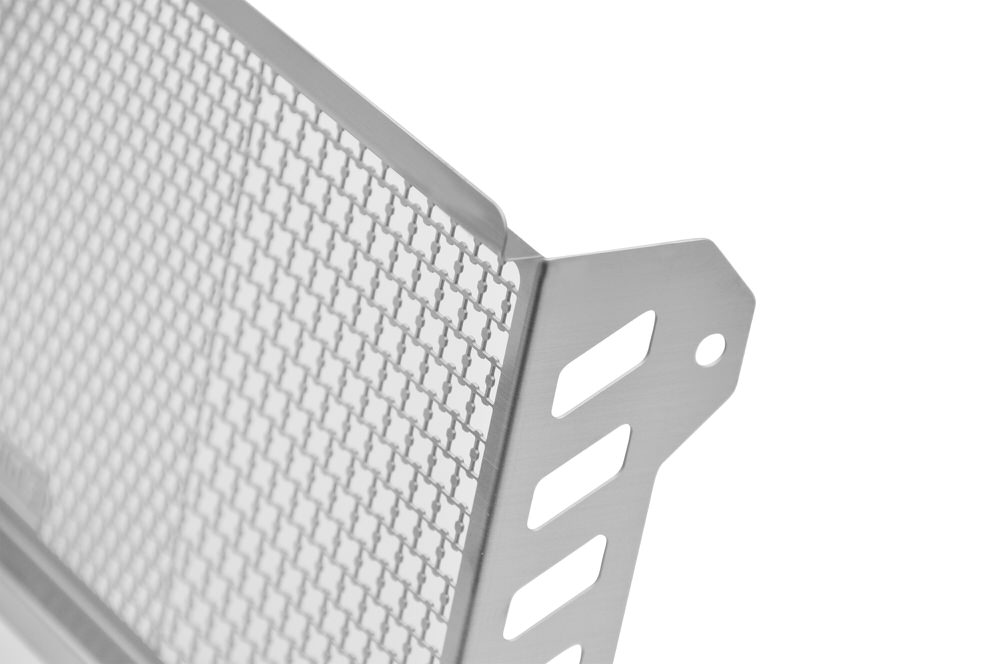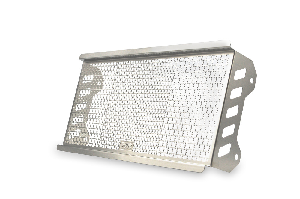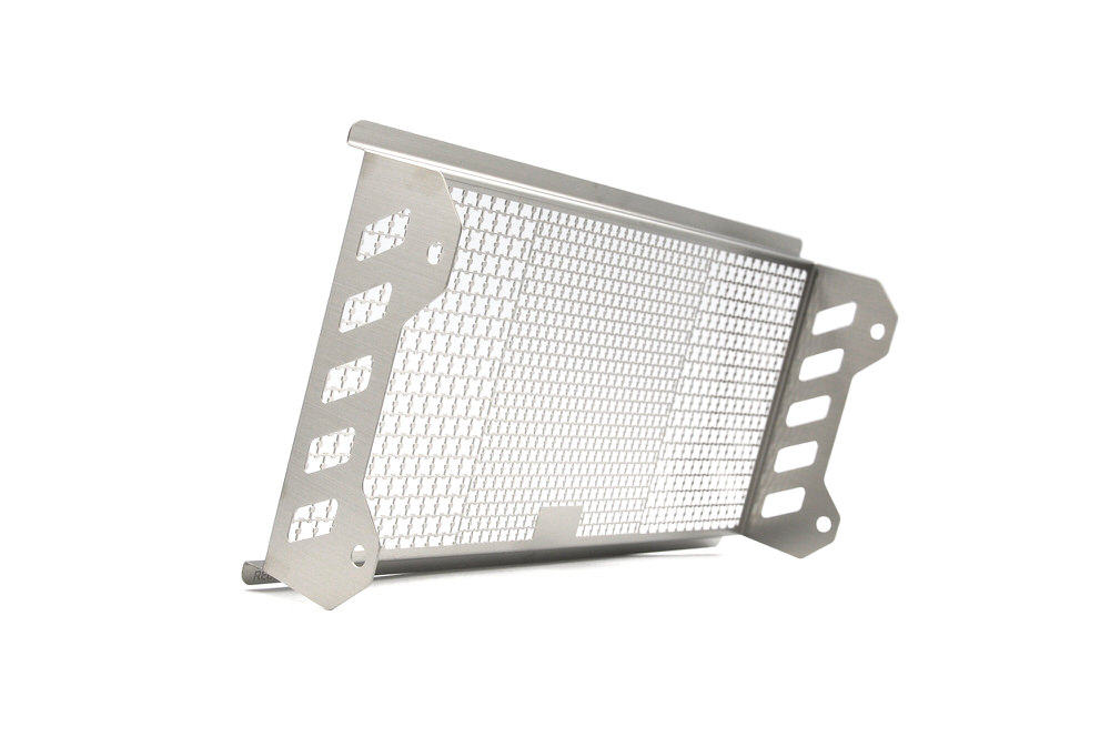 MORIWAKI Radiator Core Guard「ラジエターコアガードの役目」エンジンの冷却を行うラジエター、その心臓部分ともいえるコアは非常に薄いフィン形状で構成されています。その為、フロントタイヤから巻き上げる石やタイヤカスによりダメージを受けた場合フィンが曲り冷却効率が著しく低下します。またウォーターラインを破損した場合は走行不可になる場合も想定されます。その様な可能性からコアを保護する目的のパーツがコアガードとなります。「サクラパイプの断面形状で構成されるメッシュデザイン」コア部分のデザインはモリワキの独創性をけん引してきたフレームワークを連想させる、サクラパイプ断面形状とすることで他に類を見ないシンプルかつ上品なデザインとなりました。十分な開口率と強度を両立させたメッシュパターンは飛び石のダメージが高いセンター部分を細かく、冷却効率の高い両サイドを粗めのパターンに仕上げています。「材質にステンレスを選ぶ理由」ラジエター本来の性能を発揮するため可能な限り開口率を広げたい、そのためには材質本来の強度も必要になります。車両の前面に立ち、過酷な状況にさらされるからこそ必要となる耐久性/耐腐食性。これらの条件をクリアするのが今回選定されたステンレス材(SUS304)となります。材質:ステンレスカラー:シルバー商品重量 220g梱包サイズ 290×380×90mm梱包重量 600g