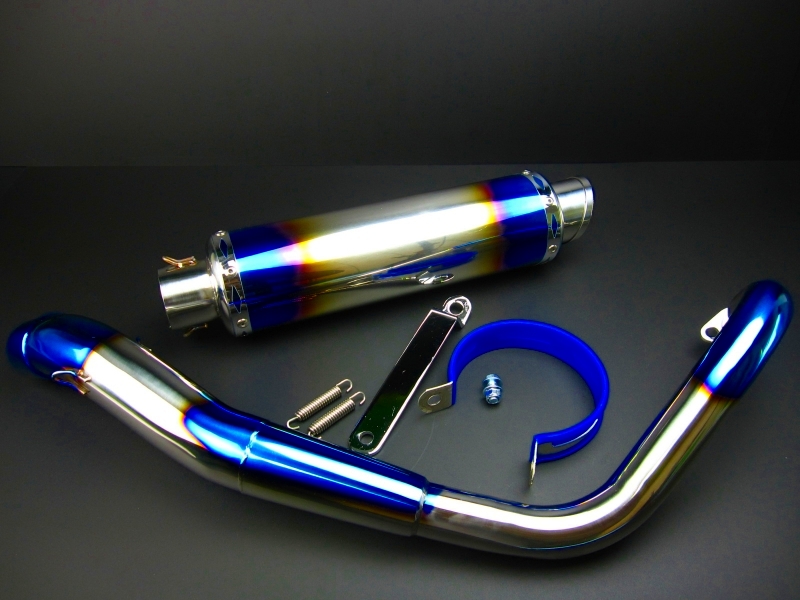 ステンレスエキパイ、ステンレスサイレンサーを採用、ブルー系レインボーカラーの鮮やかなレイシーなマフラーです。海外製マフラーながら、ステンレスの溶接繋ぎ合わせ仕様の本格タイプ。エキパイ自体の太さを微妙に変えることで、効率の良い排気を可能にしました。対応排気量50ccから170ccサイズフランジ内径:20.2mmエキパイ外形:29〜44mmエキパイとサイレンサー接続部分のエキパイ外径:50mm前後サイレンサー排気口径:51.2mmサイレンサー外形:82.0mm付属品取り付けバンド、ゴム板・・・各1個マフラースプリング・・・2個ステー・・・1個ボルト、ナット・・・各1個こちらは取り付け不可:モンキー(FI) Z50J9 AB27-1900001〜入荷時期によりサイレンサーステーが丸棒タイプになる場合もございます。非公認レーシングマフラーです。