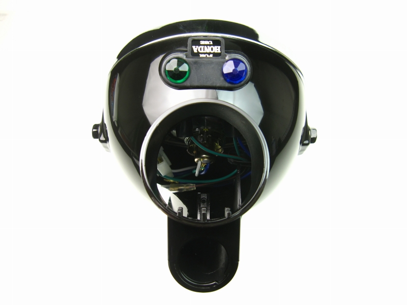 ダイヤモンドカットリフレクターで高輝度なヘッドライトです。5L/FIモンキー、ゴリラ、エイプ純正ヘッドライトケースセットと交換する高輝度化パーツです。ヘッドライトの取付けピッチは純正フォーク用です。スーパーホワイトバルブ付属で段違いの明るさいを発揮します。ホンダ純正ヘッドライトケースにも使用可能なレンズセットです。ホンダ純正フォークへボルトオンできます。カラーレンズ イエローケース ブラック製品詳細レンズ φ130mm取付ピッチ 157mmヘッドライトステー穴 M8口金 P15d-25-1HI/LO切り替えタイプ12V30/30W付属品スーパーホワイトバルブ 1ヶメーター固定用スプリング 1ヶ※6、12Vモンキー共通コネクター(110型3極端子コネクター) ※FIモンキー、モンキーAB27(キャブレター車)は純正コネクターをご使用ください)コネクタータイプは年式により異なります。FI、AB27、ゴリラ、エイプは純正ライトコネクターを再利用ください。6V電球はP15d-25-1(マツシマ規格 PH7)をご使用ください。スピードメーターはヘッドライトとは別体に仕様変更する場合にご使用いただけるヘッドライトです。
