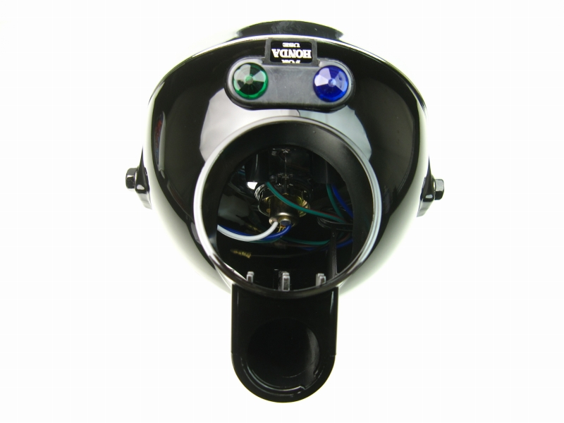 ダイヤモンドカットリフレクターで高輝度なヘッドライトです。5L/FIモンキー、ゴリラ、エイプ純正ヘッドライトケースセットと交換する高輝度化パーツです。ヘッドライトの取付けピッチは純正フォーク用です。スーパーホワイトバルブ付属で段違いの明るさいを発揮します。ホンダ純正ヘッドライトケースにも使用可能なレンズセットです。ホンダ純正フォークへボルトオンできます。カラーレンズ ブルーケース ブラック製品詳細レンズ φ130mm取付ピッチ 157mmヘッドライトステー穴 M8口金 P15d-25-1HI/LO切り替えタイプ12V30/30W付属品スーパーホワイトバルブ 1ヶメーター固定用スプリング 1ヶ※6、12Vモンキー共通コネクター(110型3極端子コネクター) ※FIモンキー、モンキーAB27(キャブレター車)は純正コネクターをご使用ください)コネクタータイプは年式により異なります。FI、AB27、ゴリラ、エイプは純正ライトコネクターを再利用ください。6V電球はP15d-25-1(マツシマ規格 PH7)をご使用ください。スピードメーターはヘッドライトとは別体に仕様変更する場合にご使用いただけるヘッドライトです。