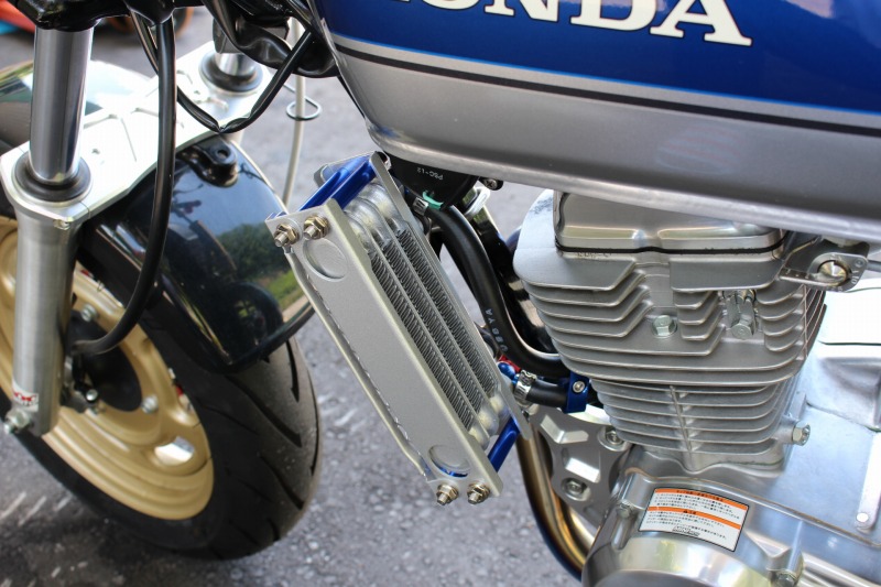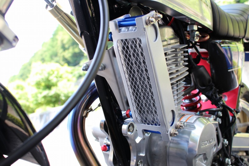 エイプ50/100共通オイルクーラーセットです。純正フェンダー位置を変更せずに取り付け可能なオイルクーラーです。オイルクーラーを縦置き配置とし、フィッティングパーツやホースラインもスタイリッシュに取り付け可能です。ホースラインを安定させるアルミ削り出しホースガイドも付属します。取り付けステーは高い耐久性を発揮するステンレス製です。オイルクーラー本体以外の部品はすべて日本製です。シリンダー、クランクケースいずれの取り出しにも対応します。仕様4段コアオイルクーラー(画像は3段コア)内径φ8ブリヂストン社製ホースバンジョーサイズ M10 ピッチ1.25mmセット内容オイルクーラー本体(プロテクターは組み込み済み) 1ヶステンレス製取り付けステーセット 1式ブリヂストン製φ8ホース 800mmアルミ製ホースガイドブルー 1ヶステンレス製ホースバンドφ16 4ヶバンジョーボルトレッドM10 P/T1.25 2ヶバンジョーM10ブルー 2ヶクラッシュワッシャーM10 4ヶシリンダー、クランクケースのフィティング部品は付属しません。取り付け時の注意純正フェンダー位置を変更せずに取り付けが可能です。オイルクーラー(4段コア)取り付けに伴いエンジンオイルを90ml追加してください。ホースは1本でのお届けです。お好みの長さにカットしてご使用ください。