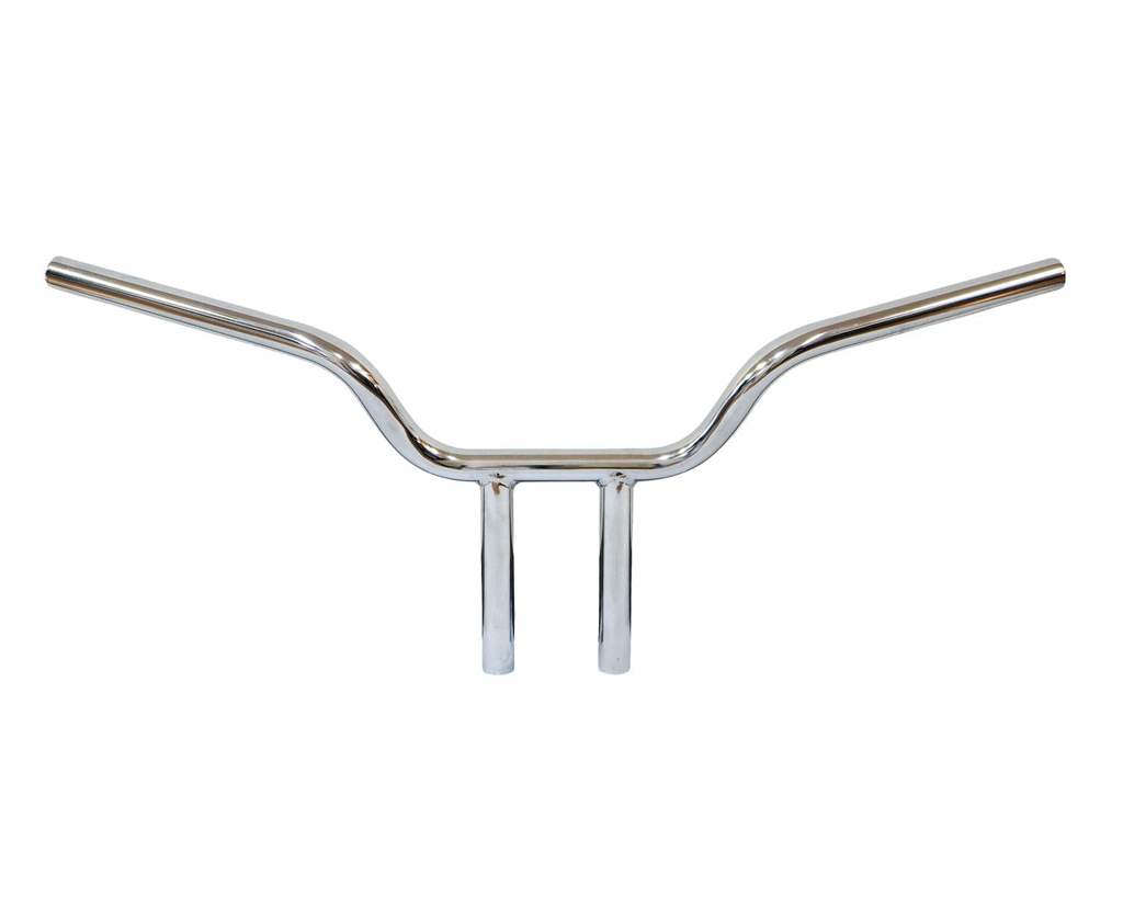 色:クロームサイズ:全幅:約760mm 高さ:約170mm(ライザー底部からハンドル中心まで)プルバック:約40mm エンドライズ:約340mm対応ライザーボルトサイズ:1/2-13適合:純正トップブリッジのライザー間隔に準拠素材:スチール内容物:ハンドルバー×1注意事項:電子スロットルやトップブリッジとライザーが一体式のモデルには対応しません。当ハンドルバーには配線逃がし用のヘコミがあります。商品説明:人気のスーパーバーとライザーの融合により一体感が得られるハンドルバーですライザーを生やす位置を試行錯誤して理想のグリップ位置を導き出した逸品であり、フリスコスタイルやクラブスタイルをはじめとし幅広いスタイルに適応します。車両のイメージチェンジに是非!