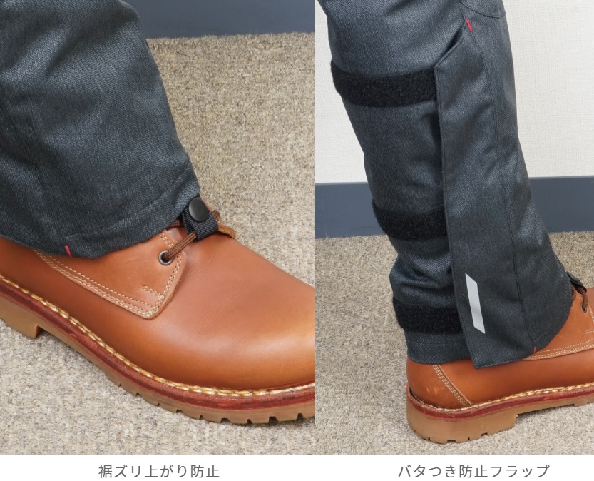 また、バイクにまたがる時、ストレスなく脚が大きく開くライディング専用 の立体裁断のため、抜群の運動性能を実現。