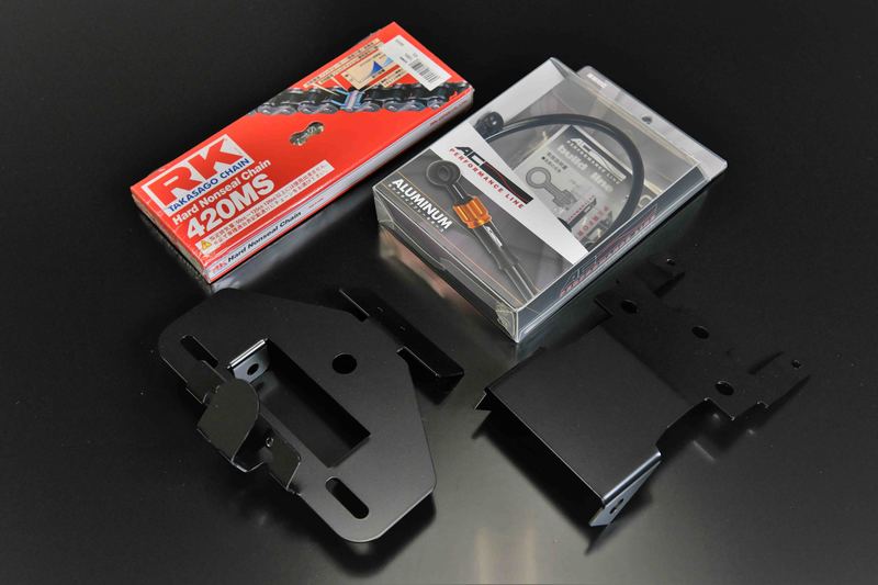 KITに含まれるもの スイングアーム本体延長ブレーキホース(アクティブ製)延長チェーン(RK製)フェンダーレスキット(純正リフレクターを使用してください。)必要な部品は全てKITに含まれますので、追加で購入いただくものはございません。加工等は一切必要ありません。完全ボルトオンで装着していただけます。純正に比べ10cmロングとなります。本製品は重要保安部品となりますので、取り付けは必ず国家資格を持つ整備士にご依頼ください。