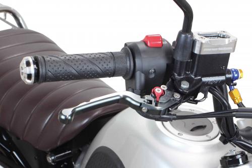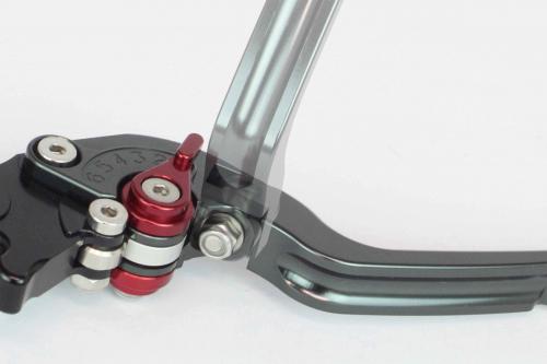 転倒の際、レバーを折損しにくくする為、レバー部分が折れ曲がる可倒式のレバーです。レバーには手のひらのサイズに合わせ、レバーの位置が調整出来るアジャストレバーが装備され、6段階の範囲で調整することが出来ます。レバー本体はアルミ材を削り出し、カラーアルマイトが施されています。レバー長は、GROM・スーパーカブC125・CT125・モンキー125のノーマルと同等となっており、多機能でありながらコンパクトにまとまっています。レバー:ガンメタルアジャストレバー:レッドホルダー:ブラックアルミの質感とカラーアルマイトがドレスアップ効果を高め、ハンドル周りを美しく演出します。SP武川社ロゴがレーザーマーキングされています。