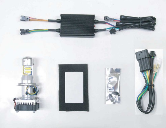 社外φ180 H4バルブ仕様ヘッドライトと組み合わせて使用します。発光色は白い6000ケルビン※取付けは取扱説明書に沿って正しく取付けてください。取付け方法を間違えると火災・故障などの原因となります。※取付け前に必ずバッテリーのマイナス側のターミナルコードを外して、キーOFFである事を確認してください。※LEDチップは触れたり汚さないでください。汚れの付着は熱溜まりによるLEDチップの焦げの原因となります。LEDバルブにはアクリルキャップが封印シールで付いています。キャップとシールを外した後、汚れによるLEDバルブの損傷については保証の対象外となりますので取扱いには十分にご注意ください。※本製品は精密機器ですので取扱いには充分ご注意ください。落としたり、配線を無理に引っ張ったりしないでください。誤った取扱いは故障の原因となったり、怪我や火傷、人命にかかわる重大な事故を引き起こす危険性があります。またスパークや絶縁不良、ショートにより本製品の故障や車両火災の原因となりますので充分ご注意ください。※本製品の分解・改造は絶対に行わないでください。分解・改造した製品の保証は受けられません。※点灯中のヘッドライト内のLED発光を直視しないでください。視覚障害の原因となります。※点灯中や消灯直後にレンズに水をかけないでください。急な温度変化でレンズやLEDバルブの破損の原因となります。また、LEDバルブ本体と後方のファン取付けステーや、コントローラーユニットは高温になりますので触らないでください。※本製品はオートバイ専用となっておりますので四輪自動車への使用はできません。四輪車用は別製品で販売しております。※紙や布で覆ったり燃えやすい物の近くで点灯させないでください。火災や異常加熱を引き起こす恐れがあります。また、可燃スプレー、シンナー等燃えやすい物や引火する危険のある物の近くでは点灯しないでください。※点灯した状態でのヘッドライトへの取付けは行わないでください。故障や火傷の原因となります。※本製品は生活防水ですが完全防水ではありません。コントローラーユニットから出ているカプラーはビニールテープや自己融着テープなどを巻くかコーキング剤などで防水処理をしてください。必要以上に水で濡らす事は避けてください。※高圧洗浄機による洗車を行う際は本製品に直接高圧洗浄が当たらないようにしてください。※LEDバルブやコントローラーユニットを落としたり、強い衝撃を与えるなどしないでください。破損や性能の低下、寿命を縮めるだけではなく、ケガの原因にもなります。※LEDバルブの組み付けには、取扱説明書中のグリスマークで示した箇所に必ず付属のシリコングリスを塗ってください。※防水ファンを覆い隠さないでください。ファン後方には吸い出した空気が流れる十分なスペースを確保してください。※ネジ部の緩み防止にネジロックをご使用ください。また定期的な増締めを行ってください。※取付けは専門知識と技術が必要です。熟練したメカニックのいる指定整備工場などで行ってください。※ご使用前に必ず光軸の調整を行ってください。対向車の視界の妨げになり、交通事故を誘発する恐れがあります。詳しくは道路運送車両の保安基準を参照ください。※本製品の取付けをした事により車両製造メーカーの保証が受けられない場合があります。※本製品の使用により生じた故障・事故などの損害については、PROTEC社で一切責任を負いかねます。また、修理の際に生じる脱着工賃やその他諸費用につきましては、PROTEC社で一切責任を負いかねます。あらかじめご了承ください。※取付け作業中または使用中に少しでも異常を感じたら、ご購入の販売店またはPROTEC社サービス課までお問い合わせください。