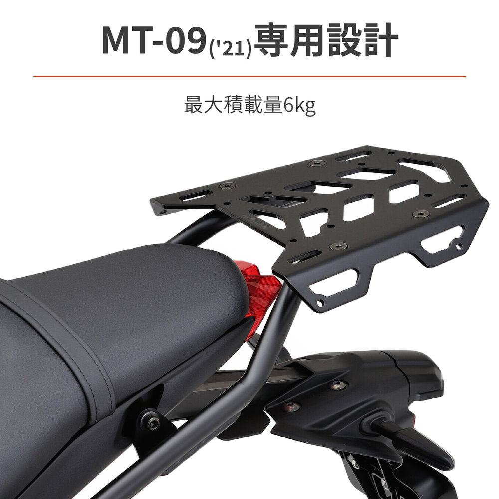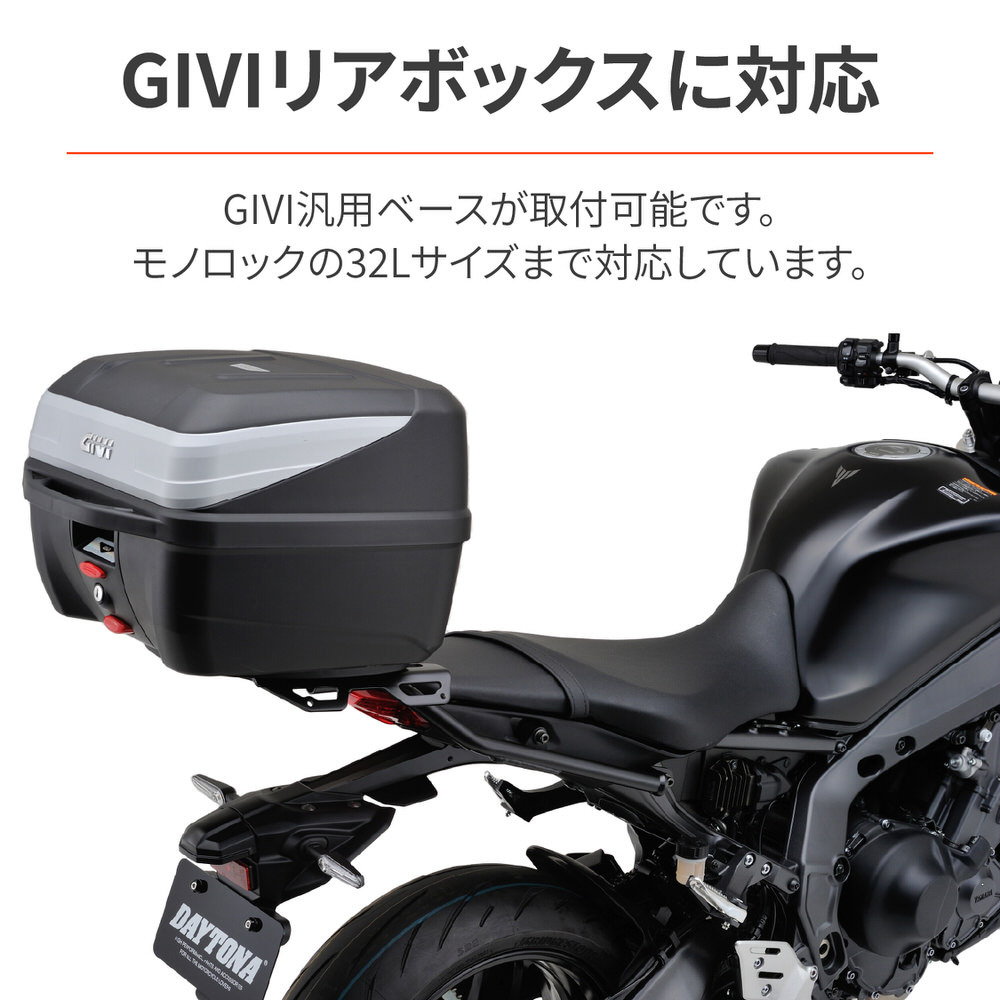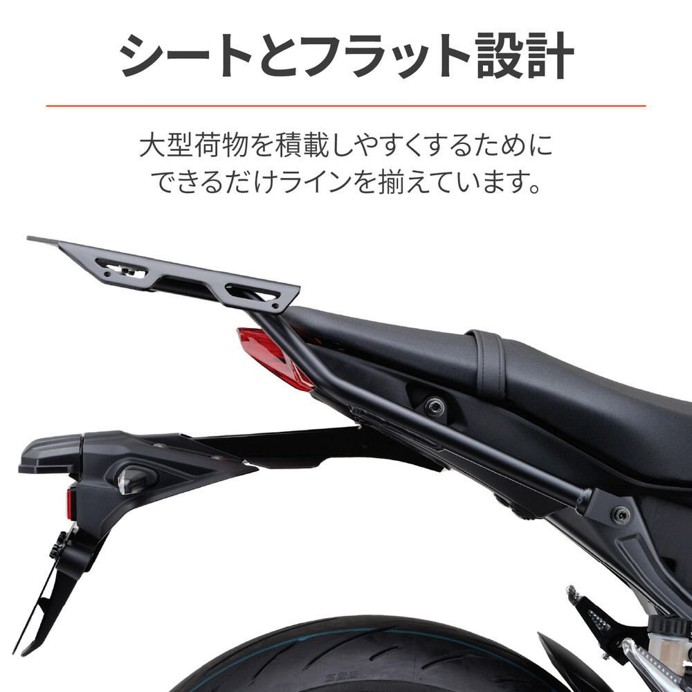 MT-09(2021年)専用リアキャリア。シートとキャリアのラインをできるだけ揃えることで、長い荷物や大きなバッグを安定して積載できます。GIVI汎用ベースが取付可能(モノロック32L以下に対応)メインパイプφ22.2 / ハイテン鋼(HT590)を採用最大積載重量:6kg※トップケース使用の際は安全を考慮し32L以下のサイズを推奨します。