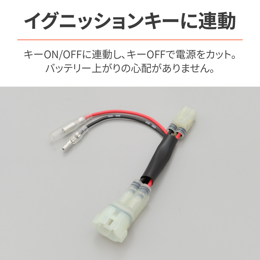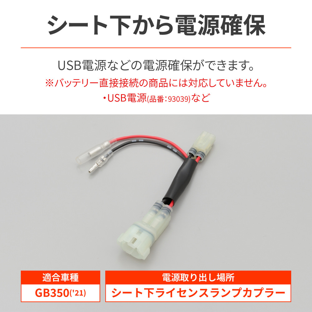 車種専用設計だから、カプラーオンでACC電源が取り出し可能。配線を加工することなくカプラーを接続するだけで簡単に+と?の配線を取り出すことができる電源取出しハーネス。イグニッションキーのON/OFFに連動し、キーOFFで電源がカットされるので、スマートフォンやナビへの給電に便利です。分かりやすい取扱説明書付きで、初心者でも安心して取り付けできます。別売のD-UNIT(品番:98830)と合わせて使うことで、シート下にACC電源4ポート拡張可能です。【適合車種】GB350(21)適合車種:GB350(21) シート下用カプラーオンでACC電源取り出しイグニッションキーに連動許容電力:12V/3A別売のD-UNITと接続可能※バッテリー直接接続の商品には対応していません。※バイク専用電源の種類によっては、接続部分をギボシに変更する必要があります。※装着する電装品のスペックを必ずご確認ください。※車両により配線加工が必要になる場合があります。※標準のギボシのタイプはCA/CB103タイプです。