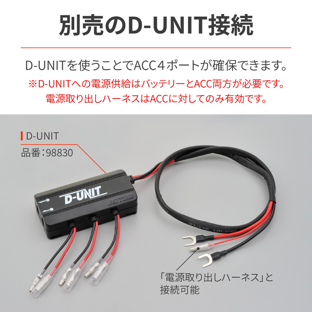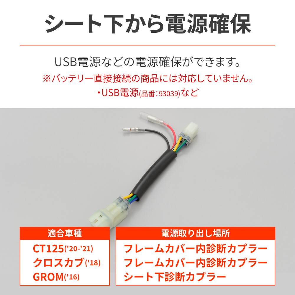 車種専用設計だから、カプラーオンでACC電源が取り出し可能。配線を加工することなくカプラーを接続するだけで簡単に+と?の配線を取り出すことができる電源取出しハーネス。イグニッションキーのON/OFFに連動し、キーOFFで電源がカットされるので、スマートフォンやナビへの給電に便利です。分かりやすい取扱説明書付きで、初心者でも安心して取り付けできます。別売のD-UNIT(品番:98830)と合わせて使うことで、シート下にACC電源4ポート拡張可能です。【適合車種】CT125(20-21)GROM(16)クロスカブ110(18)適合車種:CT125(20-21)、グロム(16)、クロスカブ110(18) シート下用カプラーオンでACC電源取り出しイグニッションキーに連動許容電力:12V/3A別売のD-UNITと接続可能※バッテリー直接接続の商品には対応していません。※バイク専用電源の種類によっては、接続部分をギボシに変更する必要があります。※装着する電装品のスペックを必ずご確認ください。※車両により配線加工が必要になる場合があります。※標準のギボシのタイプはCA/CB103タイプです。