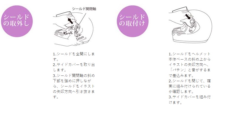 トンネル及び夜間走行の注意スモーク、ミラー加工等を施したシールドで トンネルや夜間走行をする時は視力低下を招き危険ですので、シールドを上げて走るか、STDシールドに交換してください。乾いた布で拭かないでください。シールドの汚れを取る時は水で軽く洗い、柔らかい布で拭き取り、自然乾燥させてください。強くこすると傷が付きます。薄めた中性洗剤以外は使用しないでください。酸性、アルカリ系の洗剤及び有機溶剤等※は絶対使用しないでください。シールドの割れ、蒸着メッキ膜の剥離の原因になります。※ガソリン、シンナー、ブレーキオイル等及び市販の撥水剤、曇り止め、ブレーキ等のクリーナーミラーシールドは真空蒸着メッキですので、加工の性質上、剥がれやすく通常のシールドの感覚で取扱いをされますと傷付き、コーティングが剥がれる場合があります。汚れたときは水で軽く洗い、柔らかい布で軽く押し取るように水分を拭き取り、自然乾燥させてください。なお、曇り止め液、撥水剤はミラーコートを剥がす恐れがありますので絶対に使用しないでください。