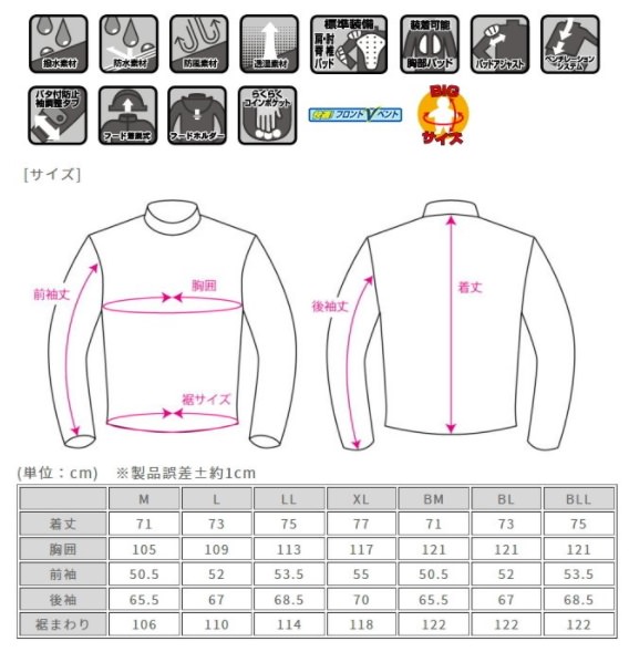 防水・防風・透湿性を兼ね備える高性能素材デュアルテックスと強力な撥水加工を施し湿気を逃がす透湿性があるため、衣服内を常にドライに保ちます。また、ラディングフォーム専用の立体裁断により、ストレスなく疲れを知らない快適な着心地です。おしゃれで上質なヘアライン柄の表地を採用。名所・旧跡地を訪ねたり、雰囲気の良いカフェにも躊躇なく入れるくらいのさりげないデザインで、行動範囲が広がります。収納に困らない多彩なポケットを備え、ショートからロングツーリングまで行動的なツーリストを強力にサポート。また、Vベント、袖ベント、後脇ベント等、爽やかで快適なベンチレーション機能を装備されているため、レイヤードを工夫すれば、春から初夏、初秋から冬と幅広いシーンと季節で活躍します。MATERIAL: 表地・裏地/ポリエステル 襟裏/アイスムースPROTECTOR: 肩・肘・脊椎パッド装備OPTION(別売り):胸パッド、インナーウェア、RR6097 コインホルダー