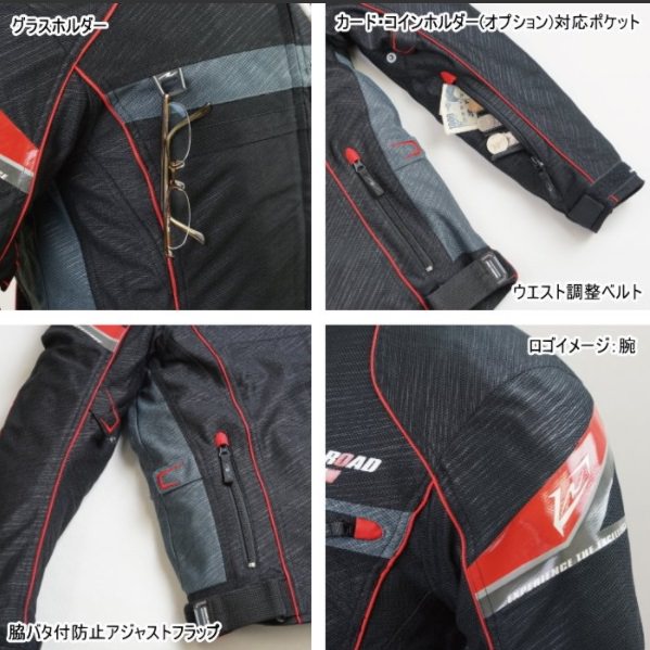 ライディングからシティーユースまで幅広くカバーするスピード感あふれるスポーティーなデザインは、跨るバイクのカテゴリーを選びません。高級感とともに優れた引き裂き強度を持つ立体構造のスパックスメッシュをメイン素材に使用することで、空気の流れを遮ることなく紫外線を効果的に遮断し、真夏の強烈な日差しから肌を守ります。胸・肩・肘・脊椎すべてをガードするフルプロテクションパッドはエアスルータイプ仕様で、抜群の通風性を確保しライディングへの集中力を妨げず、転倒にもしっかり備える安心感は他とは一線を引く別次元の仕上がりです。また、オールシーズン対応ファスナー装備で寒いときにはオプションの防風インナーを装着することも可能。女性から大きな方まで豊富に揃えたサイズ設定であらゆるニーズに応えます。MATERIAL:表地/スパックスメッシュ 裏地/スーパーエアメッシュ 襟裏/アイスムースメッシュPROTECTOR:胸・肩・肘・脊椎パッド標準装備OPTION(別売り):RR6097 コインホルダー