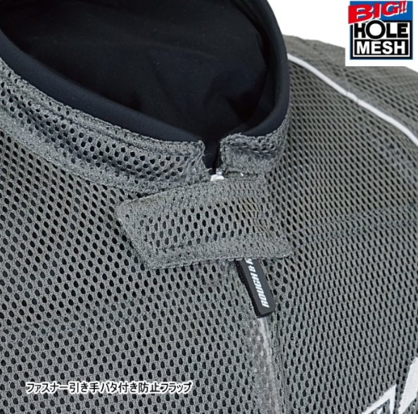 ”究極のメッシュジャケット”がコンセプト。ライディングの集中力を妨げる酷暑からライダーを解放するのがこのジャケットの使命です。ビッグホールメッシュ生地をメインに使用することで、大量のフレッシュエアーを導入しボディをクールダウン。加えて裏地を省くことにより抜群の放熱性を誇り、暑さによる集中力の低下を最小限にします。さらには胸・肩・肘・脊椎にエアスルーパッドを標準マウンし通気性をとことんまで突き詰めた、”放熱”するために生まれた真夏対応のジャケットです。MATERIAL: 表地/ビックホールメッシュ 襟裏/アイスムースメッシュPROTECTOR: 胸・肩・肘・脊椎パッド標準装備