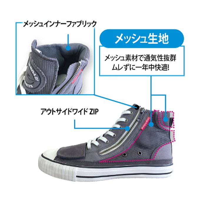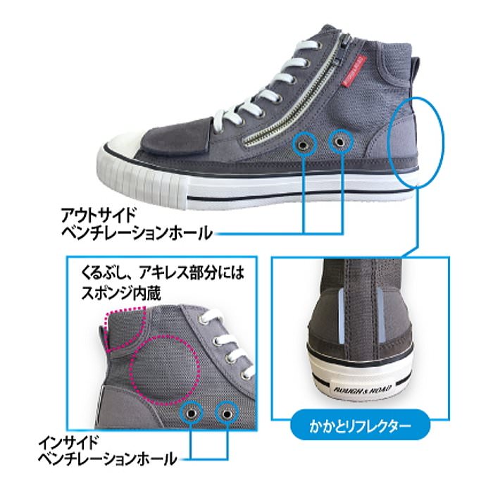 目指したのはオンライドとオフライドの融合というチョット欲張りなスニーカーです。最大のセールスポイントはメイン素材をメッシュ生地にした通気性の良さで、 夏のライディングシーンを快適にします。斜めに大きく開くファスナーは脱ぎ履きのしやすさ抜群、しかも外側ファスナーなので車体を傷つける心配がありません。踵にはリフレクターを付け視認性も確保。また、くるぶし内側に厚めのクッションを入れニーグリップをしやすくしています。左足に装備した大きめのシフトガードは、幅5.5センチとシフト場所の個人差にも余裕で対応。バイク用品メーカーがバイク乗りのために作ったスニーカーです!機能紹介・メッシュ仕様・外側ジッパー仕様・くるぶしプロテクション(内外)・左足シフトガード・ベンチレーション・リフレクターMATERIAL: 本体/メッシュ、キャンバス