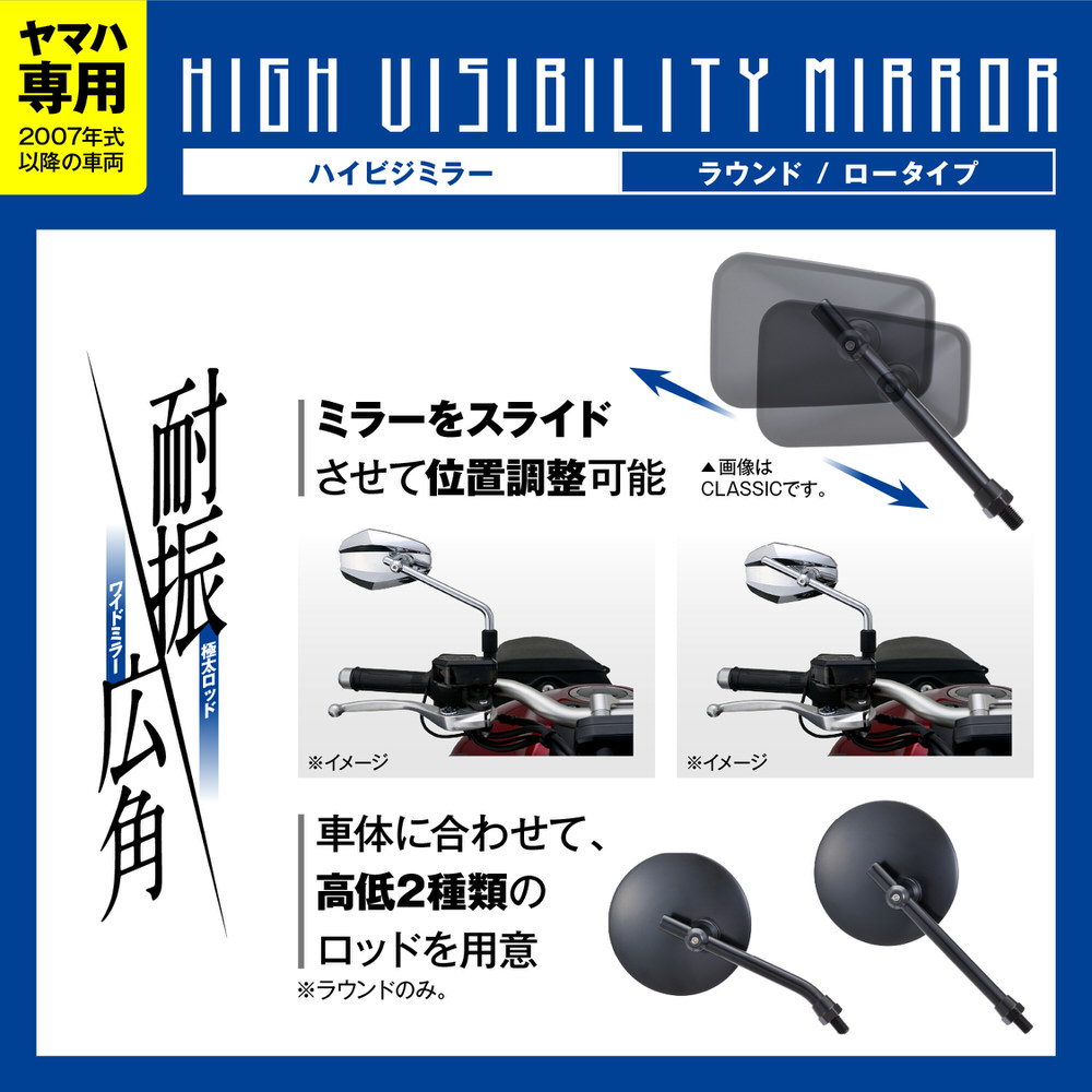 ヤマハ純正ミラーの衝撃緩衝装置をそのまま流用し、オフセットバーとハウジングのみ交換する。純正ミラーより広角な曲率R1000の鏡を使用し、より広い後部視界を確保。ロッド上をスライドさせてミラーハウジング位置を調整可能。振動の多いSR400などでも後方視界を安定して確保できるようにφ12の極太ロッドを採用。鏡の貼り付け強度をアップしたことで鏡の共振を減らし、クリアな視界を実現しています。【参考適合車種】ヤマハ2007年式以降の車両・ブラックMT-25/03/07/09XSR700/900TRACER900/GTBOLTDRAG STAR400(14-17)MAJESTY250・クロームSR400DRAG STAR400(07-13)DRAG STAR250MAXAM【用途】耐震性と広角視認性をそなえたヤマハ専用ミラー【仕様1】直径12mmの極太ロッドを採用し、鏡の取付強度を高くすることで、振動の多いバイクでもミラーがぶれにくい仕様【仕様2】一般的な純正ミラーが曲率R1200-1300に対し、R1000の鏡面を採用しているので、後方視界を広く確保【仕様3】オーソドックスなラウンド形状【仕様4】新保安基準適合品※旧基準(〜2006年)のYAMAHA車には適合しません。※適合車種以外のYAMAHA車には適合しません。※純正バーエンドミラーの車両は取付不可です。