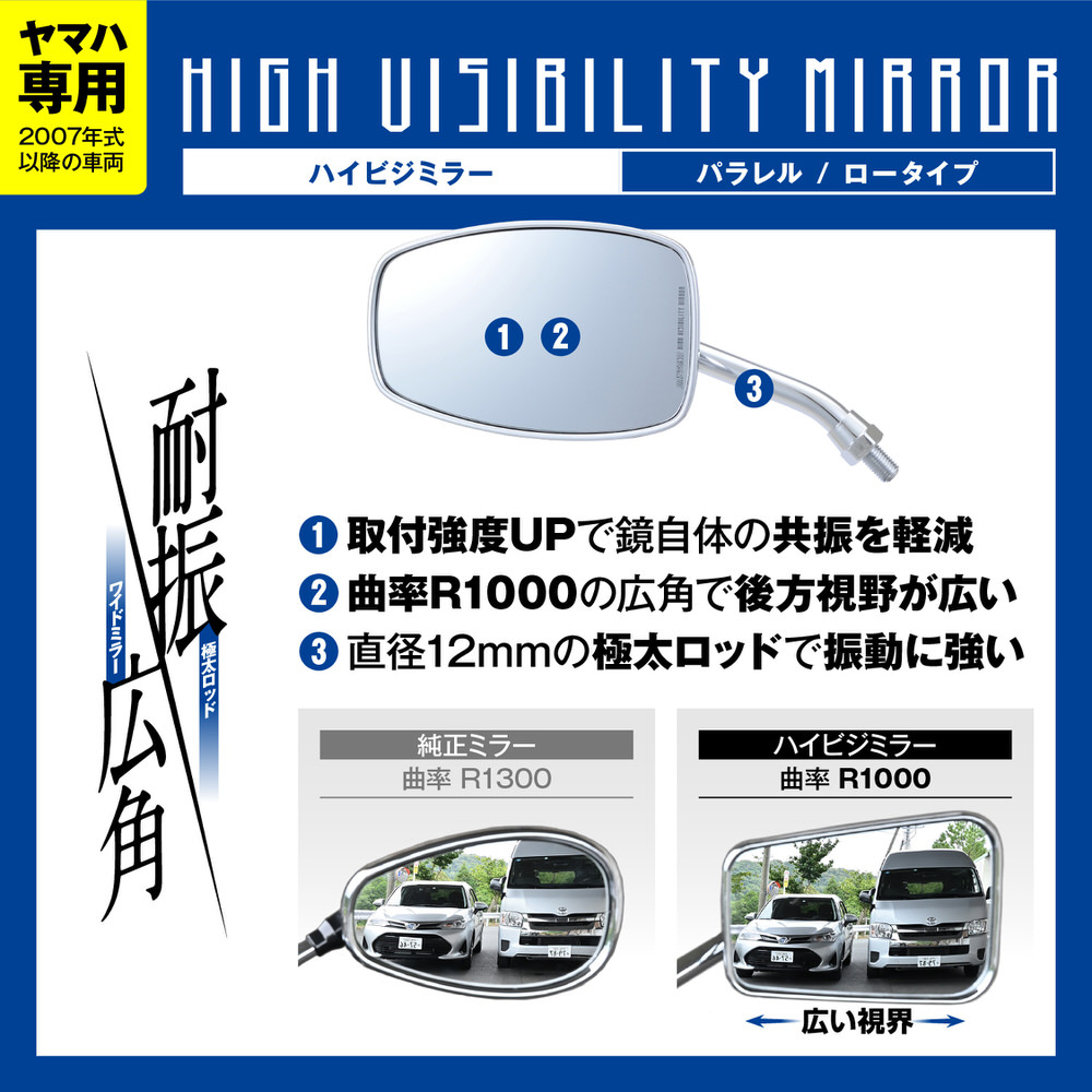 ヤマハ純正ミラーの衝撃緩衝装置をそのまま流用し、オフセットバーとハウジングのみ交換する。純正ミラーより広角な曲率R1000の鏡を使用し、より広い後部視界を確保。ロッド上をスライドさせてミラーハウジング位置を調整可能。振動の多いSR400などでも後方視界を安定して確保できるようにφ12の極太ロッドを採用。鏡の貼り付け強度をアップしたことで鏡の共振を減らし、クリアな視界を実現しています。【参考適合車種】ヤマハ2007年式以降の車両・ブラックMT-25/03/07/09XSR700/900TRACER900/GTBOLTDRAG STAR400(14-17)MAJESTY250・クロームSR400DRAG STAR400(07-13)DRAG STAR250MAXAM【用途】耐震性と広角視認性をそなえたヤマハ専用ミラー【仕様1】直径12mmの極太ロッドを採用し、鏡の取付強度を高くすることで、振動の多いバイクでもミラーがぶれにくい仕様【仕様2】一般的な純正ミラーが曲率R1200-1300に対し、R1000の鏡面を採用しているので、後方視界を広く確保【仕様3】ボリューム感あるスクエアデザインのパラレルモデル【仕様4】新保安基準適合品※旧基準(〜2006年)のYAMAHA車には適合しません。※適合車種以外のYAMAHA車には適合しません。※純正バーエンドミラーの車両は取付不可です。