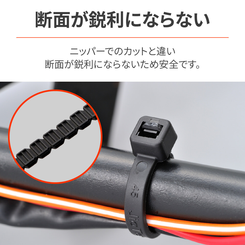 工具不要、手でちぎれる結束バンド。手でくるっとひねるだけでカットが可能です。ニッパーなどの工具がいらないので、ツーリング時の携帯用としても便利です。断面が鋭利にならないので怪我をする心配もありません。屋外仕様でも安心な耐候仕様。手でちぎれる結束バンド屋外で使える耐候仕様102mm 80本入り