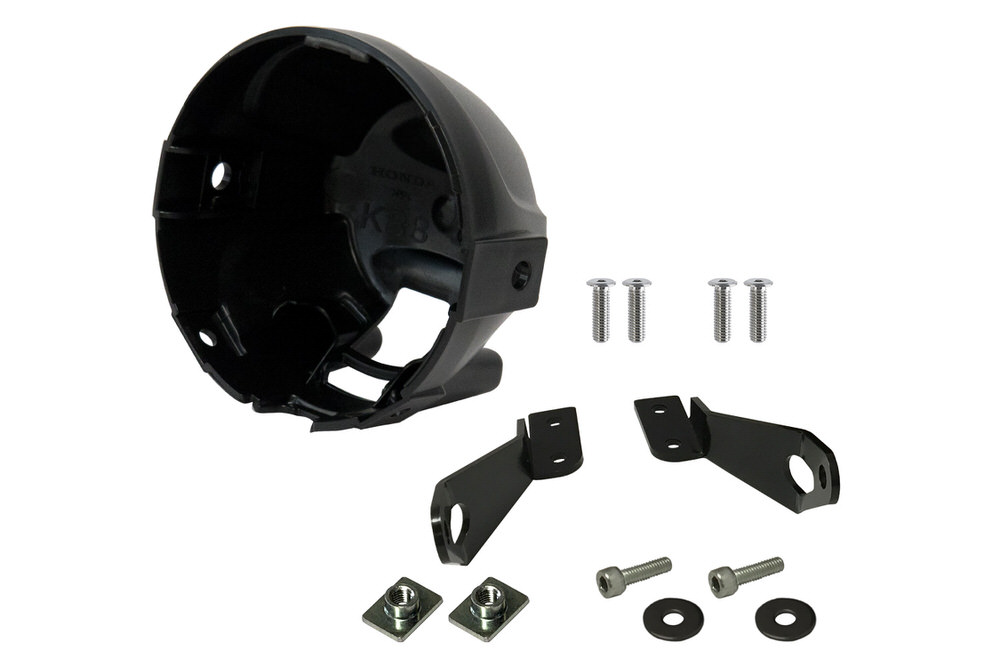 材質:スチール(ステー)セット内容:ホンダ純正ヘッドライトケース・専用ステー・取り付けボルト類・取扱説明書日本製カブをバーハン化するにあたり、必要となってくるアイテムの1つ「ヘッドライト」。この純正のヘッドライトケースを使用すれば、そのまま中身を移し替えるだけ!専用の取り付けステーが付いているので、ハンドルポストキット(wh-6-1)にボルトオンで装着できます。あとは、お手持ちのノーマルのヘッドライトリムを装着すれば完成です。※光軸調整ボルトも純正から付け替えてください。※デザイン・仕様は予告なく変更されることがございます。予めご了承ください。
