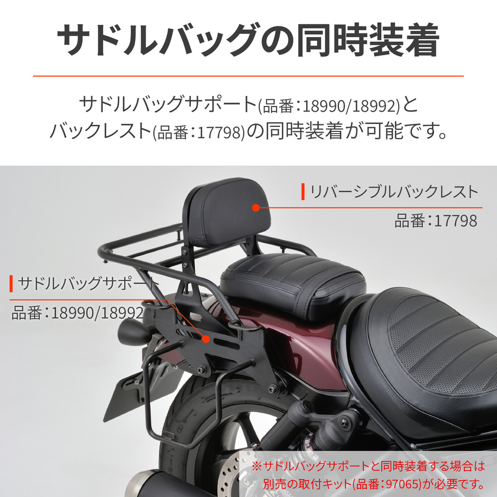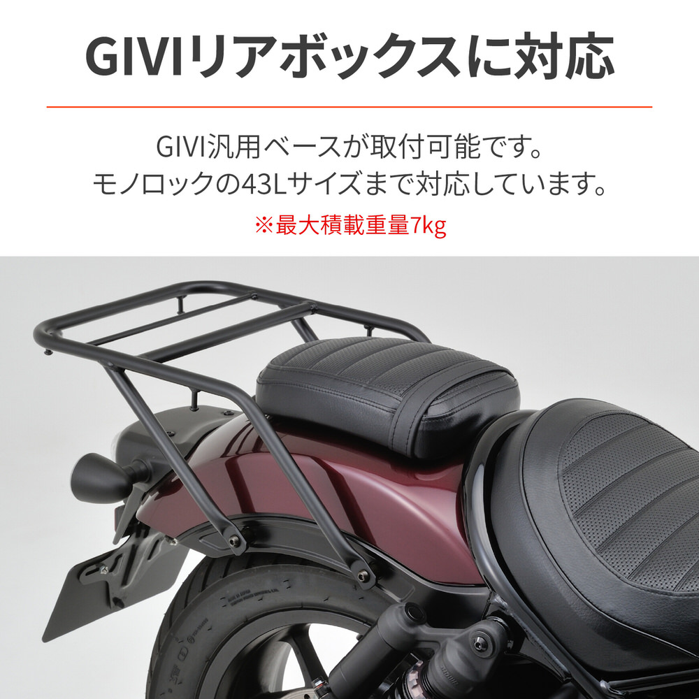 タンデムシートとキャリアの上面を揃えることで、フラットな面積が広く、大きな荷物も安全に積載できます。GIVIのモノロックケース43L以下に対応、汎用ベースが取付可能です。リバーシブルバックレスト(品番:17798)が同時装着可能。サドルバッグサポート(品番:18990/18992)との同時装着が可能。別途サドルバッグサポート取付キット(品番:97065)が必要です。タンデムシートとキャリアの上面を揃えることで、大きな荷物も積載可能リバーシブルバックレスト(品番:17798)、サドルバッグサポート(品番:18990/18992)との同時装着が可能積載部分寸法:長さ310×幅314(mm)最大積載量:7kg※最大積載重量7kgです。※サドルバッグサポートを同時装着する場合は、別途サドルバッグサポート取付キット(品番:97065)が必要です。左右にサドルバッグサポートを取り付けの場合は2個必要となります。
