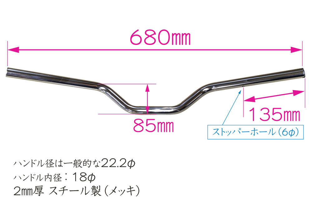 材質:スチール(アルミ削り出し加工)セット内容:バーハンドル幅:680mm(詳細は上部の画像で記載)ハンドル径:22.2φ ハンドル内径:18φパイプの厚さ:2mm日本製ハンドル径22.2φであれば、車種問わず使用可能なバーハンドルです。スーパーカブ110ハンドルポストキットでの使用の場合は、ワイヤー類の変更の必要はございません。ノーマルのグリップも取り付ける事が可能です。※純正のバーエンドは使用できません。※こちらはバーハンドルのみの販売となっております。※デザイン・仕様は予告なく変更されることがございます。予めご了承ください。