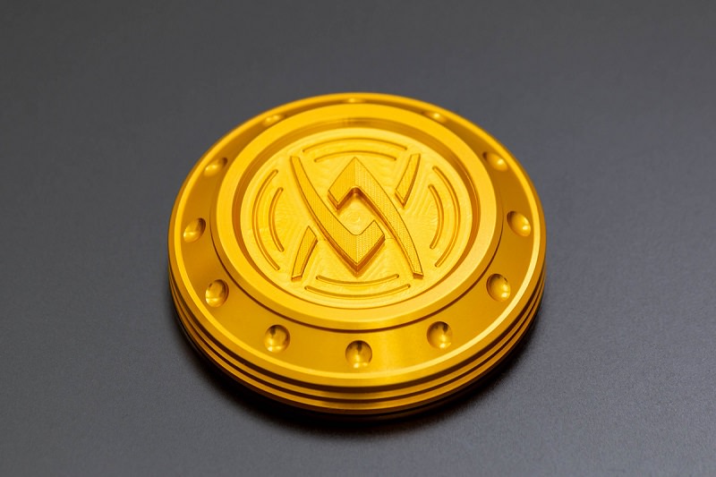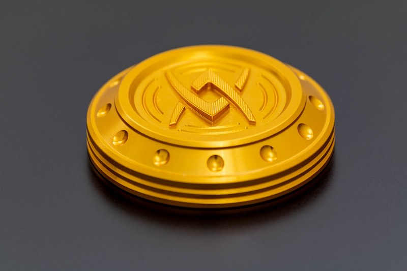 アルミ無垢材から削り出されたARCHIロゴは、中心から端へ向かってテーパー状に削り立体感を持たせ、全面にわたる緻密な切削デザインと相まってシンプルで簡素なコクピットに強烈なワンポイントとして存在感を主張します。