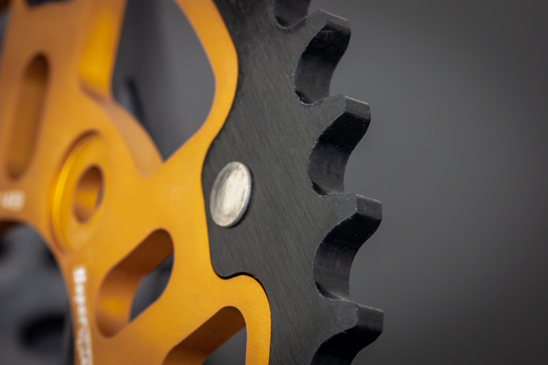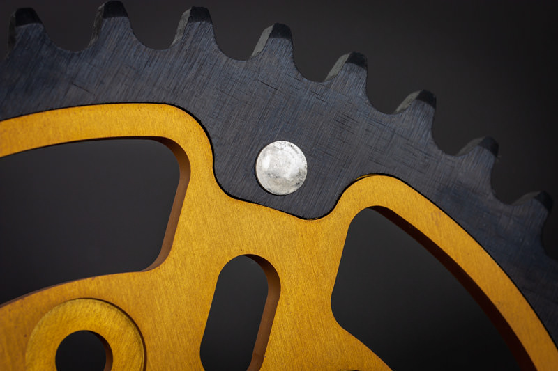 外周のチェーンにかかるティース(歯先)部分には耐久性のあるスチール製、ホイールハブやスプロケットキャリアに勘合するインナー部は軽量なアルミ素材を採用し、強靭な鍛造リベットによって結合され耐久性、軽量化を両立したハイブリッド構造スプロケット。