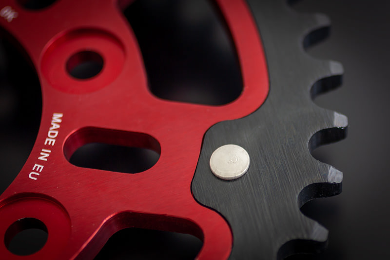 外周のチェーンにかかるティース(歯先)部分には耐久性のあるスチール製、ホイールハブやスプロケットキャリアに勘合するインナー部は軽量なアルミ素材を採用し、強靭な鍛造リベットによって結合され耐久性、軽量化を両立したハイブリッド構造スプロケット。
