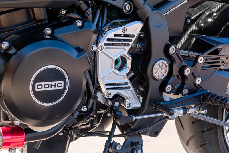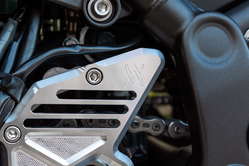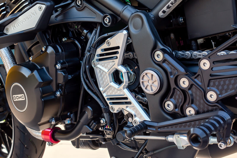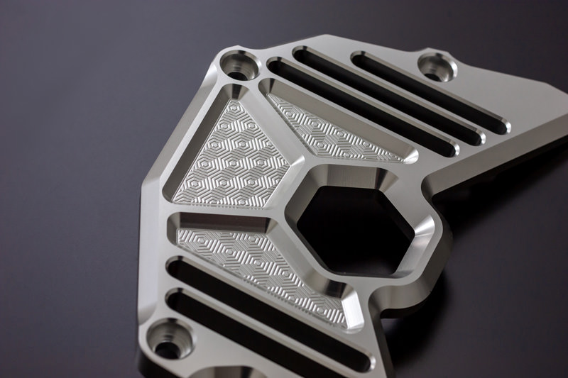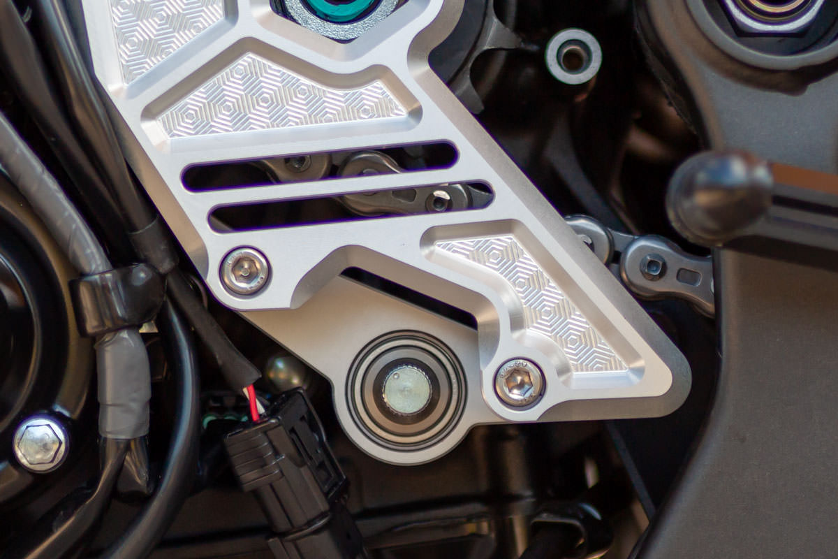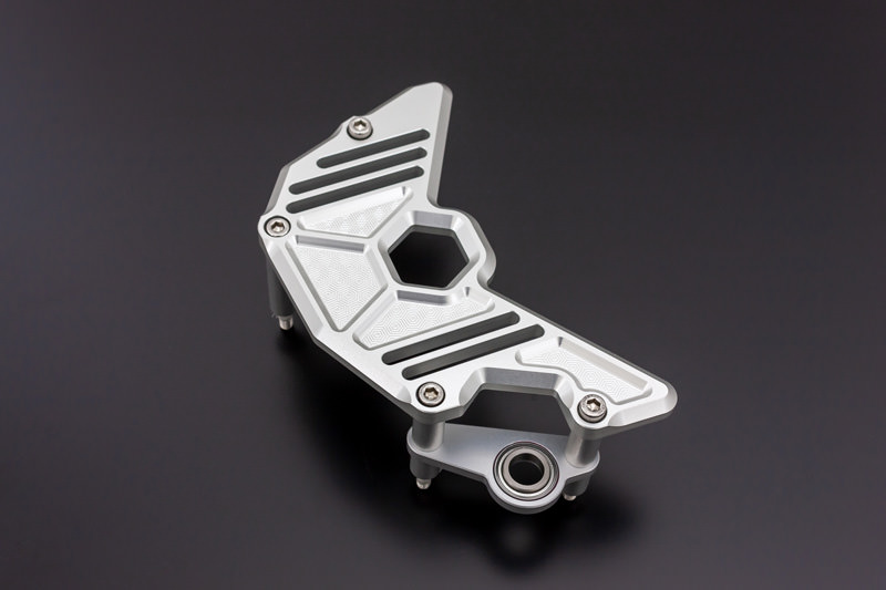 10mm厚の無垢材から削り出され、大胆な肉抜き加工とコンパクトなデザインはカバーの奥にチラリと見えるスプロケットやドライブチェーン周りと相まってエンジンのメカニカルな美しさを一層引き立てます。シフト操作の際に起こるチェンジシャフトのしなりや弛みを軽減させるシフトホルダーを装備し、確実でダイレクトなシフトフィールを実現します。取付に必要なマウントボルト付き。