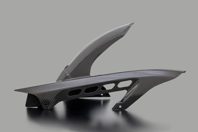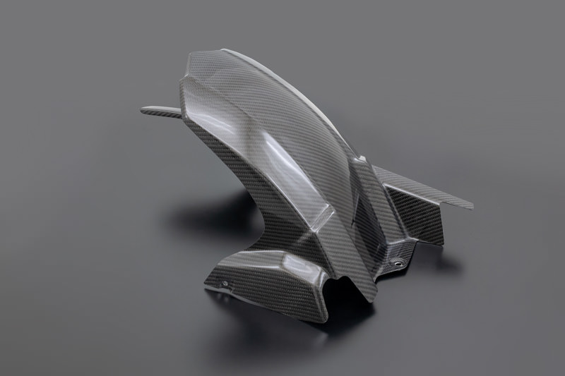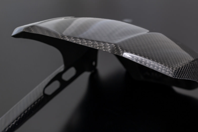 STDのチェーンカバーを兼ねたデザインを踏襲しながら約120mm後方に延長することで、泥跳ねや水跳ねを大幅に軽減すると共に、 テールカウルとタイヤとの「隙間感」を無くす事で、より一層攻撃的でレイシーなリアビューを飾り上げます。ver.2では形状を見直すことで、タイヤのアールに美しく沿いながらも、ノンストレスで装着ができるほど歪みを減らすことに成功。また、製造方法も大きく変更することで、カーボン繊維本来の美しさが引き立つクリアなコーティングに仕上がっています。取付けはノーマルリアフェンダーと付け換えるだけのボルトオン