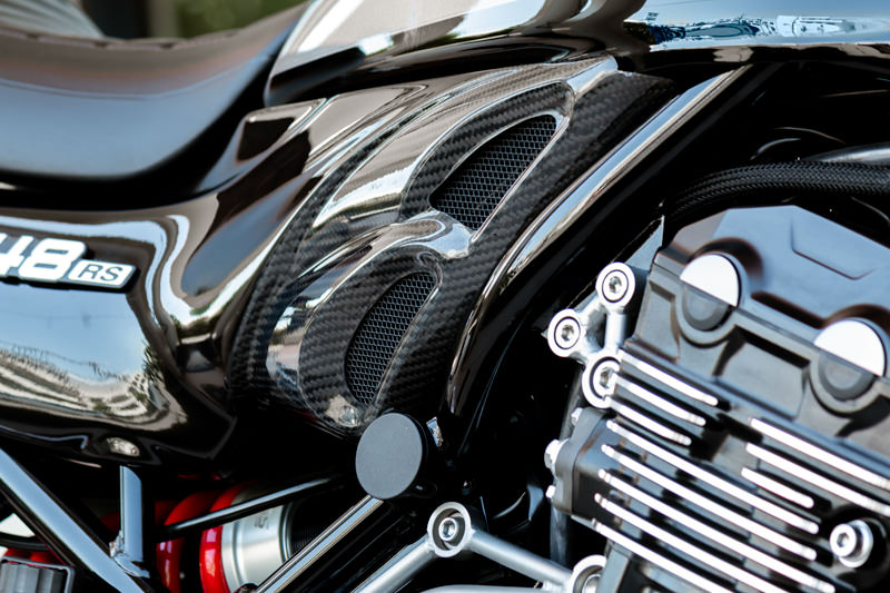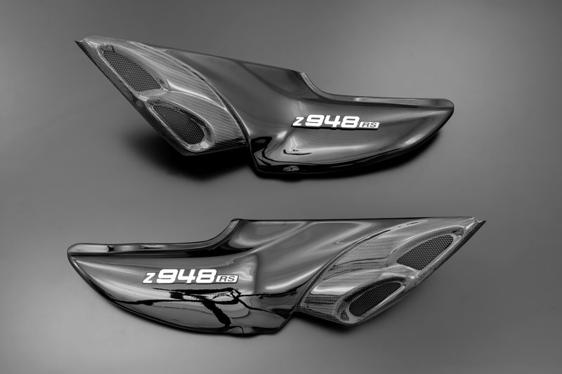 Double Bubble Intake(D.B.I/ダブル・バブル・インテーク)両サイドには段違いで二つの膨らんだバブル形状がセットされ、強烈なハイフローエアーの吸引を連想させる大口径エアーインテークの開口部にはメッシュネットも装備され一層攻撃的なインパクトとサイドビューの十分過ぎる存在感を演出させます。サイドカバー本体部はZ1を連想させる”シンプルかつ立体的な造形美”と同時にエアインテーク部のボリュームに違和感のないグラマラスで流麗なフォルムにモディファイすることでタンクからテールカウルに至るシルエットをスパルタンなイメージに変貌させます。インテーク部と称される前方部は綾織カーボンファイバー、後部のサイドカバー本体部はFRPのグラスファイバーを使用するハイブリッド構造。FRPのボディ本体は、各純正同等色の塗装仕上げです。タンクを傷つけないよう保護するラバーモールが付属します。※Z948RSのエンブレム(左右)を同梱させていただきます。