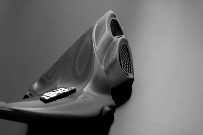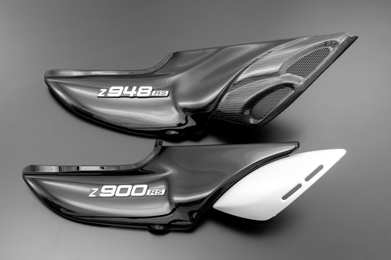 Double Bubble Intake(D.B.I/ダブル・バブル・インテーク)両サイドには段違いで二つの膨らんだバブル形状がセットされ、強烈なハイフローエアーの吸引を連想させる大口径エアーインテークの開口部にはメッシュネットも装備され一層攻撃的なインパクトとサイドビューの十分過ぎる存在感を演出させます。サイドカバー本体部はZ1を連想させる”シンプルかつ立体的な造形美”と同時にエアインテーク部のボリュームに違和感のないグラマラスで流麗なフォルムにモディファイすることでタンクからテールカウルに至るシルエットをスパルタンなイメージに変貌させます。インテーク部と称される前方部は綾織カーボンファイバー、後部のサイドカバー本体部はFRPのグラスファイバーを使用するハイブリッド構造。FRPのボディ本体は、カスタムペイント用の未塗装の黒色ゲルコート仕上げです。タンクを傷つけないよう保護するラバーモールが付属します。※Z948RSのエンブレム(左右)を同梱させていただきます。
