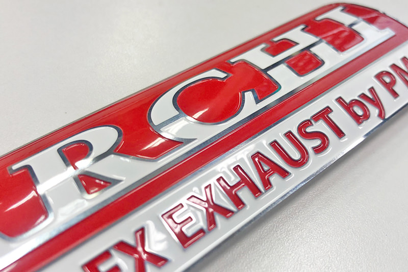 エキゾーストサイレンサー用の両面テープタイプ「ARCHI」エンブレム。サイズ:122mmx38mm
