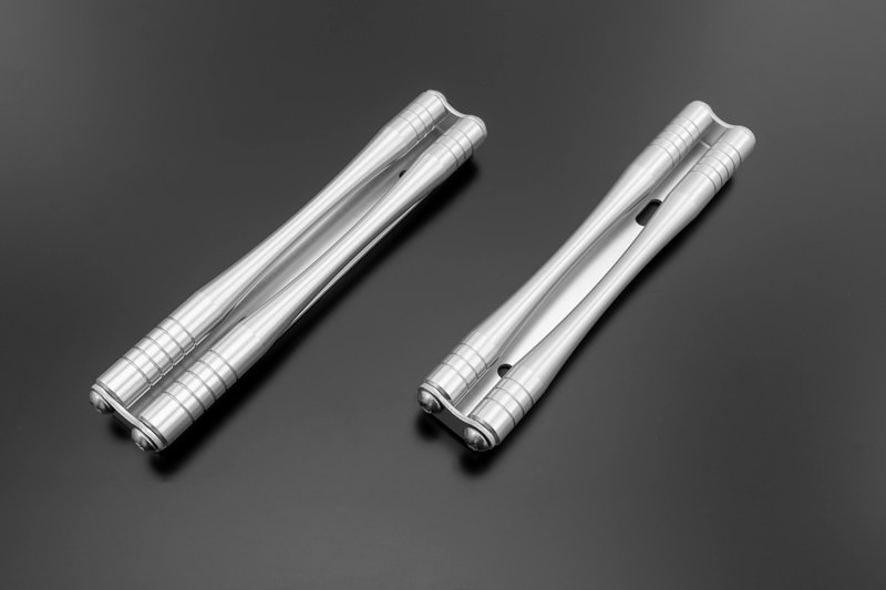 オールビレットで製作された重厚感あふれるツインロッドセットを装備することで、無機質なラジエターを、Z900RSの風格に見合うゴージャスなサイドビューに変貌させます。ロッド本体はジュラルミン系 2017材を用い、上下部にVカット溝を施しウエストラインを強調することでZ900RSにベストマッチするデザインに仕上げました。ゴージャスなサイドロッドを支えるマウントブラケットは、ロッド先端のアールに沿わせるデザインにこだわり抜き、精密レーザーカッターにて切り出したのちに高精度プレスにて成型しています。