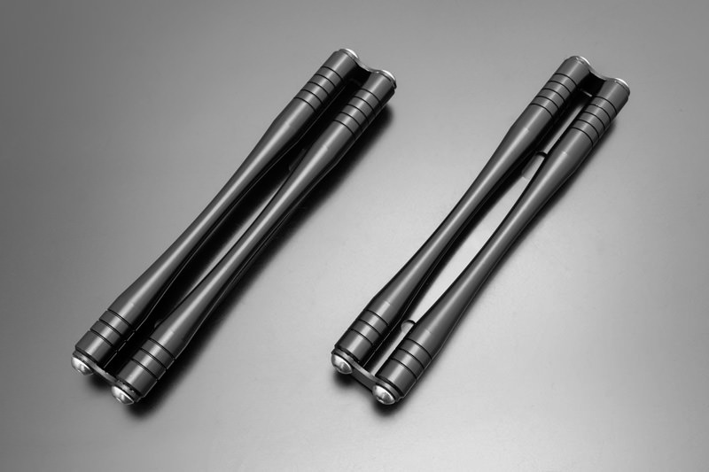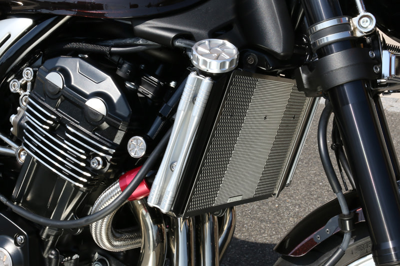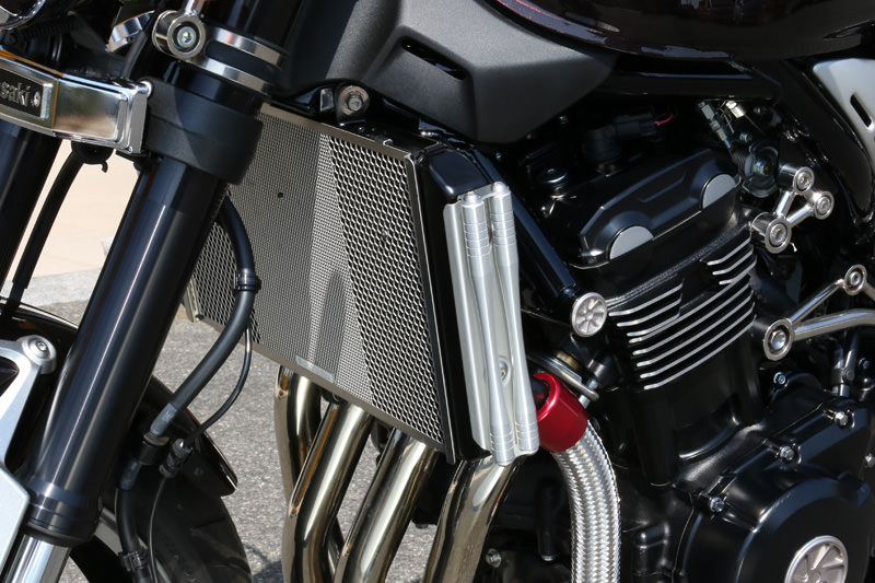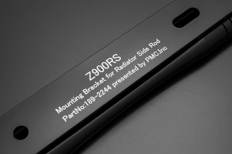 オールビレットで製作された重厚感あふれるツインロッドセットを装備することで、無機質なラジエターを、Z900RSの風格に見合うゴージャスなサイドビューに変貌させます。ロッド本体はジュラルミン系 2017材を用い、上下部にVカット溝を施しウエストラインを強調することでZ900RSにベストマッチするデザインに仕上げました。ゴージャスなサイドロッドを支えるマウントブラケットは、ロッド先端のアールに沿わせるデザインにこだわり抜き、精密レーザーカッターにて切り出したのちに高精度プレスにて成型しています。