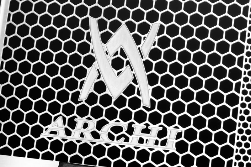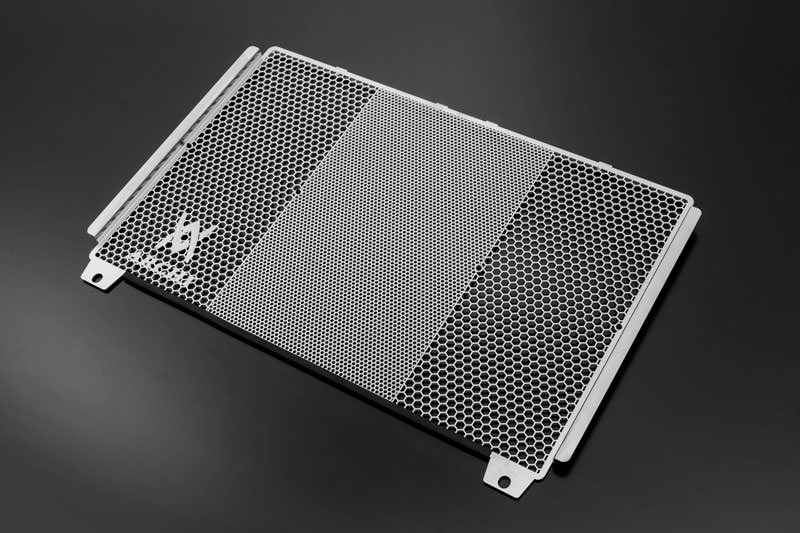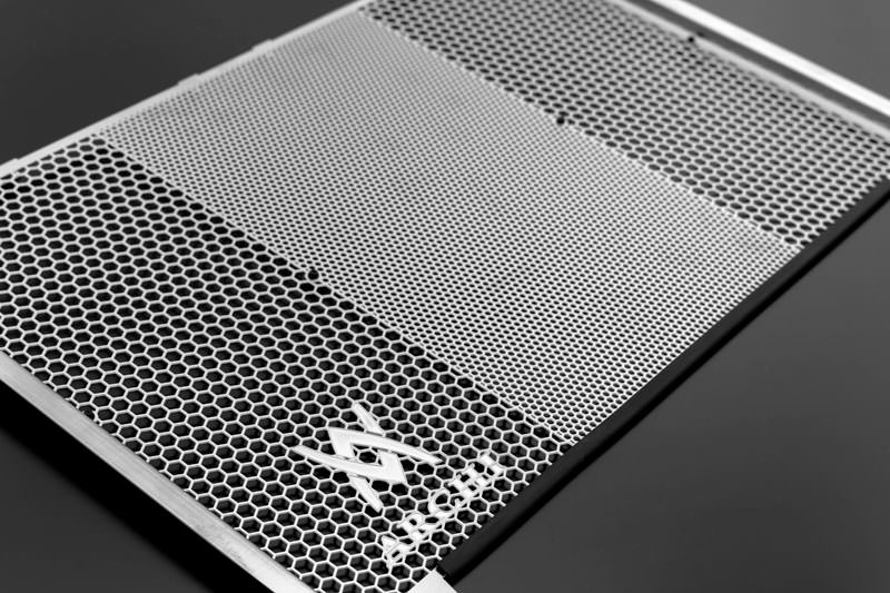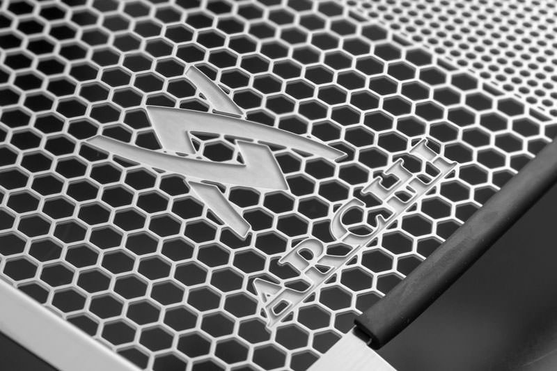 フロントタイヤの真後に当たるセンター部は走行中に巻き上げられた小石やゴミから確実にコアをガードする細かいメッシュ、また両サイドは通風性を考慮した粗いメッシュを配置し、コアガードとして求められる保護と冷却性能を両立。幾何学的な美しさを感じさせるハニカムメッシュパターンとワンポイントであしらわれたARCHIロゴはエンジン前部のドレスアップ効果も兼ね備えます。0.8mm厚のステンレス材を使用し、長期使用においても汚れを洗い落とすだけでステンレス 特有の美しさを維持します