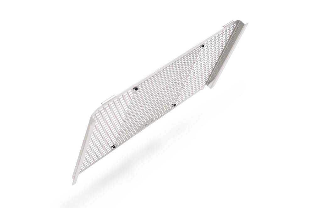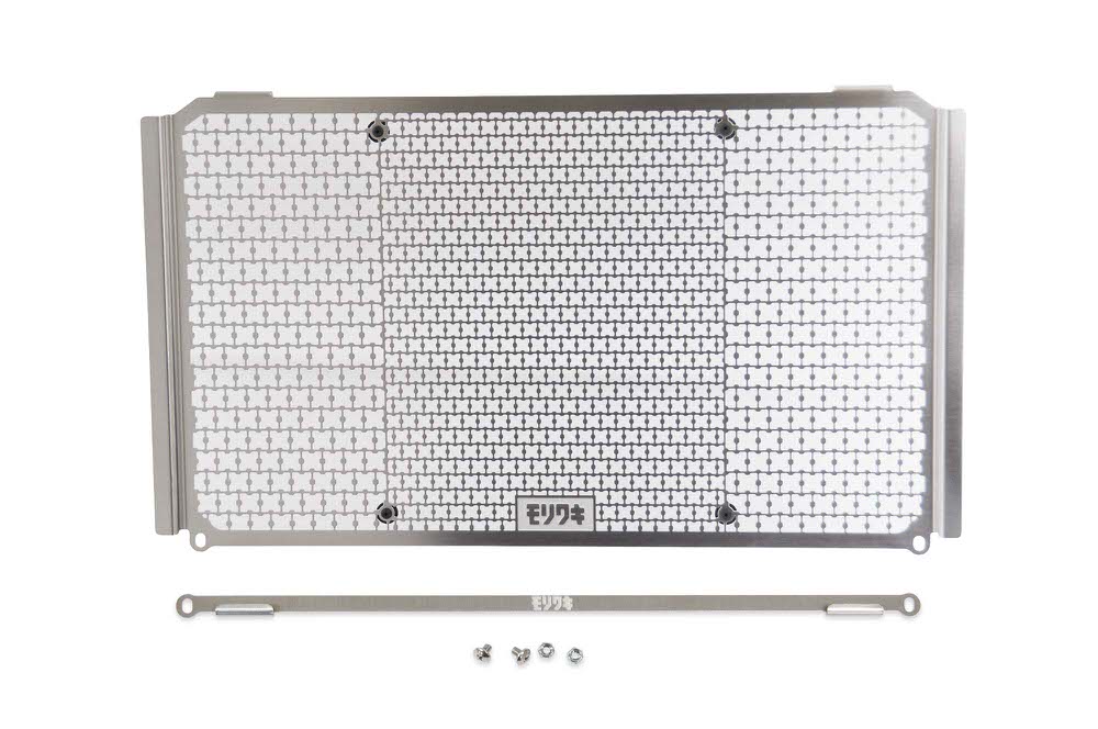 MORIWAKI Radiator Core Guard「ラジエターコアガードの役目」エンジンの冷却を行うラジエター、その心臓部分ともいえるコアは非常に薄いフィン形状で構成されています。その為、フロントタイヤから巻き上げる石やタイヤカスによりダメージを受けた場合フィンが曲り冷却効率が著しく低下します。またウォーターラインを破損した場合は走行不可になる場合も想定されます。その様な可能性からコアを保護する目的のパーツがコアガードとなります。「サクラパイプの断面形状で構成されるメッシュデザイン」コア部分のデザインはモリワキの独創性をけん引してきたフレームワークを連想させる、サクラパイプ断面形状とすることで他に類を見ないシンプルかつ上品なデザインとなりました。十分な開口率と強度を両立させたメッシュパターンは飛び石のダメージが高いセンター部分を細かく、冷却効率の高い両サイドを粗めのパターンに仕上げています。金属本来の光沢を楽しみマシンに美しい輝きを与えるステンレスポリッシュ。「材質にステンレスを選ぶ理由」ラジエター本来の性能を発揮するため可能な限り開口率を広げたい、そのためには材質本来の強度も必要になります。車両の前面に立ち、過酷な状況にさらされるからこそ必要となる耐久性/耐腐食性。これらの条件をクリアするのが今回選定されたステンレス材(SUS304)となります。材質 ステンレスカラー シルバー