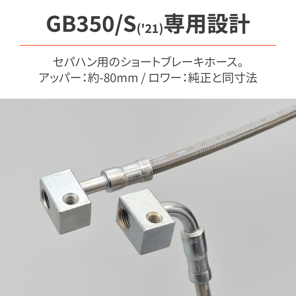 セパレートハンドルや低いハンドル使用時に使えるショートケーブル。GB350/S専用のショートブレーキホース。アッパー(純正比約-80mm)とロワー(純正と同寸法)のセット。ニチリン製を採用し、ブレーキタッチが向上。純正比約-80mmシーリングワッシャー付属バンジョーボルトは純正品または相当品を使用※ブレーキホースの交換作業が必要です。重要保安部品のため認証工場での作業が義務付けられています。※ABS採用車のためエア抜きの難易度が非常に高くなります。※ABSモジュールにエアが噛まないように慎重な作業が必要です。作業中はイグニッションをONにしないでください。