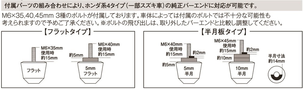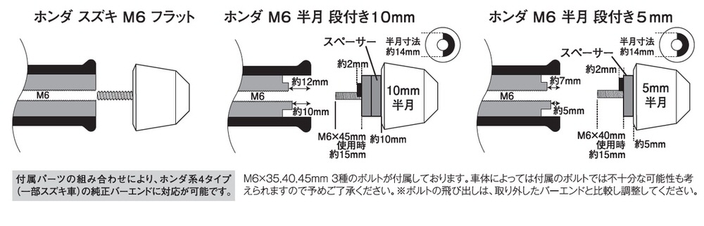 ホンダ、スズキ、ヤマハ車純正M6タイプ(純正ハンドルバー用)付属パーツの組み合わせにより、ホンダ、スズキ、ヤマハ車の純正バーエンドに対応が可能です。取り付け用ボルトは3種類(M6×35,40,45mm)付属しております。【素材/材質】アルミ削り出しアルマイト/メッキ仕上げ【重量】1個あたり約75g【付属品】M6×35、40、45mm 3種のボルト【仕様】最大外径:29.5mm左右セット日本製※ボルトの飛び出しは、取り外したバーエンドと比較し調整してください。※車体によっては付属のボルトでは不十分な可能性も考えられますので予めご了承ください。※取り付けの際、脱落防止の為、ネジロック剤の塗布を推奨致します。DUNK(2014-2018年)クロスカブ50(2018年)クロスカブ50(2009-2013年)スーパーカブ50(2018-2019年)クロスカブ110(2018年)スーパーカブ110(2018-2019年)GROM(グロム)MONKEY125(2019年)PCX125/150(2011-2016年)PCX125/150(2018年)CB250R(2018年)CBR250RR(2017-2019年)CBR250R(2011-2016年)FAZE(フェイズ)FORZA(フォルツァ)(MF10)FORZA MF13(2018年)CBR400R(2016-2018年)400X(2018年)CB400SF(1999-2019年)CB400SB(2005-2019年)HORNET600CBR600RR(2003-2016年)CBR650F(2014-2017年)CB650F(2014-2017年)NC700X/S(2012年)NM-4(2015-2017年)NC750S(2016-2018年)NC750X(2017-2018年)HORNET900CBR1000RR(2004-2019年)CB1000R(2018年)CB1100(2017-2019年)CB1300SF(1998-2019年)CB1300SB(2005-2019年) GSX1400(2001/2006-2007年)GSX1300R(-2018年)GSX-S750(2017年)GSR750(2013-2015年)YZF-R1(2018年)YZF-R25(-2018年)YZF-R3(-2018年)MT-25(-2018年)MT-03(-2018年)