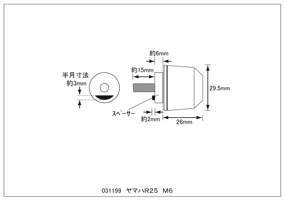 “シンプルなデザイン”ソリッドバーエンド!ヤマハ車純正M6タイプ(純正ハンドルバー用)付属パーツの組み合わせにより、ヤマハ車の純正ハンドルに対応が可能です。【素材/材質】アルミ削り出しアルマイト/メッキ仕上げ【重量】1個あたり約50g【付属品】ヤマハ車専用スペーサーM6×40mmボルト【仕様】最大外径:29.5mm左右セット日本製※使用するグリップ・車種によってはワッシャー等で調整が必要な場合があります。※ボルトの飛び出しは、取り外したバーエンドと比較し調整してください。※車体によっては付属のボルトでは不十分な可能性も考えられますので予めご了承ください。※取り付けの際、脱落防止の為、ネジロック剤の塗布を推奨致します。YZF-R25(2015-2019年)YZF-R3(2015-2019年)MT-25(2016-2019年)MT-03(2016-2019年)