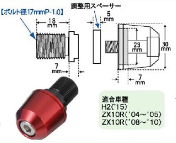 カワサキ車純正17mmハンドル用※取り付けの際、脱落防止の為、ネジロック剤の塗布を推奨致します。カワサキ純正ハンドル用【サイズ】取付け部M17/P1.0【重量】1個あたり約60g左右セット【適合参考車種】ZX-10R(2004-2005年)(2008-2015年)ニンジャ H2(2015-2017年)