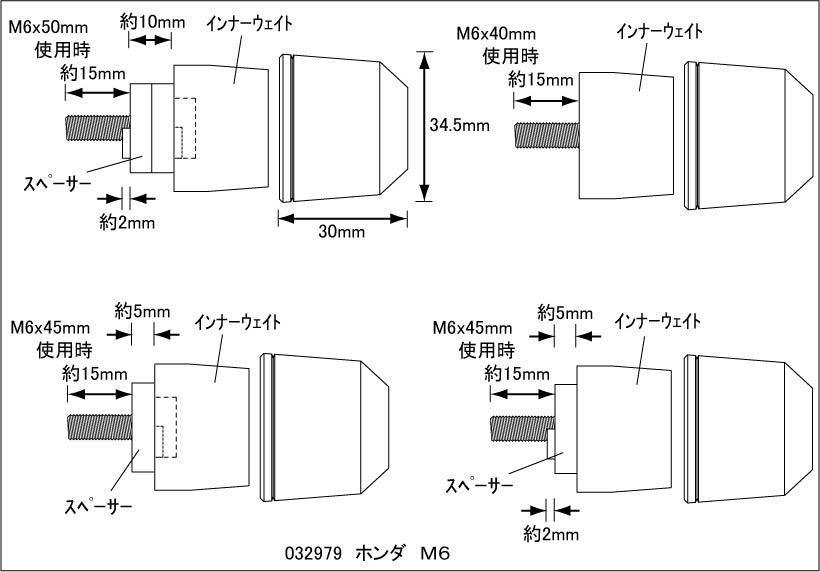 内側に防錆処理を施した真鍮ウェイト、外側にアルミカバーを採用することで、機能性と美観を両立、カバーのみの交換可能、大阪の自社アルミ加工工場で製作され、クオリティは抜群です。HONDA SUZUKI系 M6タイプ ミドルウェイトバーエンド【重量】1個あたり約150g【サイズ】外径Φ34.5mm(最大径)M6×40、45、50mm 3種のボルトが付属しております。車種によっては付属のボルトでは不十分な可能性も考えられますので予めご了承ください。ボルトの飛び出しは、取り外したバーエンドと比較し調整してください。付属アルミカラーの組み合わせによりホンダ系純正ハンドル各タイプに対応したバーエンドです。※取り付けの際、脱落防止の為、ネジロック剤の塗布を推奨致します。【適合参考車種】DUNK(2014-2018年)クロスカブ50(2018年)クロスカブ50(2009-2013年)スーパーカブ50(2018-2019年)クロスカブ110(2018年)スーパーカブ110(2018-2019年)GROM(グロム)MONKEY125(2019年)PCX125/150(2011-2016年)PCX125/150(2018年)CB250R(2018年)CBR250RR(2017-2019年)CBR250R(2011-2016年)FAZE(フェイズ)FORZA(フォルツァ)(MF10)FORZA MF13(2018年)CBR400R(2016-2018年)400X(2018年)CB400SF(1999-2019年)CB400SB(2005-2019年)HORNET600CBR600RR(2003-2016年)CBR650F(2014-2017年)CB650F(2014-2017年)NC700X/S(2012年)NM-4(2015-2017年)NC750S(2016-2018年)NC750X(2017-2018年)HORNET900CBR1000RR(2004-2019年)CB1000R(2018年)CB1100(2017-2019年)CB1300SF(1998-2019年)CB1300SB(2005-2019年) GSX1400(2001/2006-2007年)GSX1300R(-2018年)GSX-S750(2017年)GSR750(2013-2015年)YZF-R1(2018年)YZF-R25(-2018年)YZF-R3(-2018年)MT-25(-2018年)MT-03(-2018年)