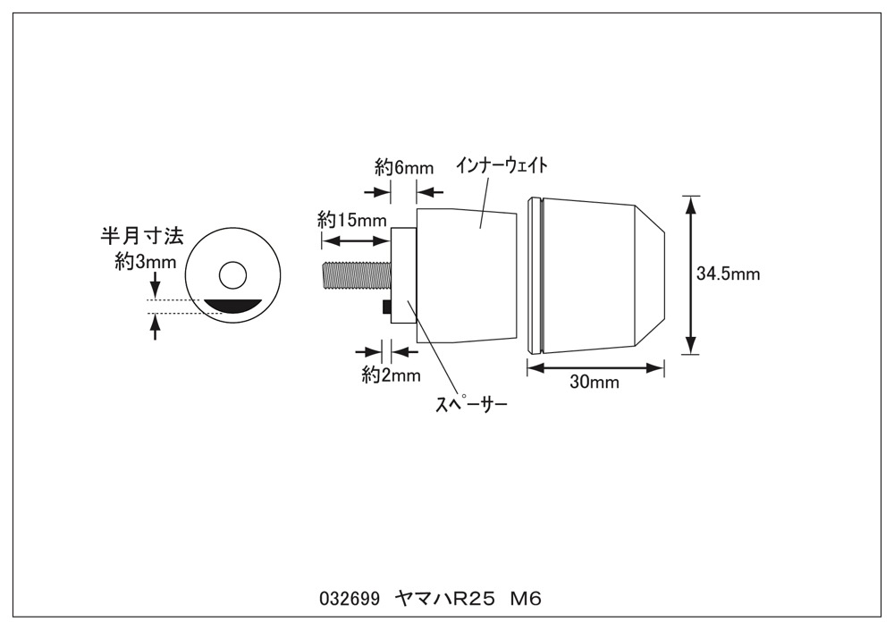 “ちょい重”ミドルウェイトバーエンド!2重構造、内側に防錆処理を施した真鍮ウェイト、外側にアルミカバーを採用することで機能性と美観を両立。好みや車体色に合わせてカラーをお選びいただけます。日本製でハイクオリティな仕上がりになっています。付属パーツの組み合わせにより、ヤマハ車M6タイプの純正ハンドルに対応が可能です。【素材/材質】インナー:真鍮メッキ仕上げアウター:アルミアルマイト/メッキ仕上げ【重量】1個あたり約140g【付属品】ヤマハ車専用スペーサー:2個M6×45mmボルト:2本【仕様】・防振ウェイトバランサータイプ・最大外径:34.5mm・全長:30mm・日本製※使用するグリップ・車種によってはワッシャー等で調整が必要な場合があります。※ボルトの飛び出しは、取り外したバーエンドと比較し調整してください。※車体によっては付属のボルトでは不十分な可能性も考えられますので予めご了承ください。※取り付けの際、脱落防止の為、ネジロック剤の塗布を推奨致します。【適合参考車両】YZF-R25(2015-2021)YZF-R3(2015-2021)MT-25(2016-2020)MT-03(2016-2020)N-MAX(2017-2020)