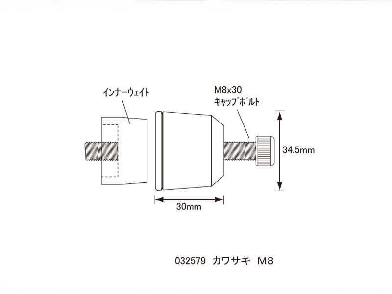 内側に防錆処理を施した真鍮ウェイト、外側にアルミカバーを採用することで、機能性と美観を両立、カバーのみの交換可能、大阪の自社アルミ加工工場で製作され、クオリティは抜群です。KAWASAKI系 M8タイプ ミドルウェイトバーエンド【重量】1個あたり約120g【サイズ】外径Φ34.5mm(最大径)※取り付けの際、脱落防止の為、ネジロック剤の塗布を推奨致します。【適合参考車種】ZX14R(2012-2020)ZZR1400 ZRX1200DAEGZRX1200R/S(-2008)ZZR1200 ZRX1100 ZEPHYR1100/RS ZZR1100 GPZ1100 ZX10RR(2017-2020)NINJA1000(2003-2021)ZX10R(2011-2018)Z1000(2014-2018)Z900RS(2018-2021)Z900RSCAFE(2018-2021)GPZ900RZX-9RZX-7R Z800(2013-2016)Z750(2004-2010)Z750S(2006-2007)NINJA650R(2009-2011)NINJA650(2012-2016)NINJA400R(2011-2013)NINJA400(2014-2020)NINJA250R(2008-2012)NINJA250(2013-2020)Z250/ABS(2013-2020)NinjaZX-25R(2021)NinjaZX-25RSE(2021)