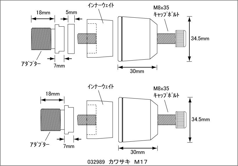“ちょい重”ミドルウェイトバーエンド!2重構造、内側に防錆処理を施した真鍮ウェイト、外側にアルミカバーを採用することで機能性と美観を両立。日本製でハイクオリティな仕上がりになっています。 カワサキ純正ハンドル用【サイズ】取付け部M17/P1.0【重量】1個あたり約324g左右セットカワサキ車純正取付け部M17/P1.0のハンドルに対応【素材/材質】インナー:真鍮メッキ仕上げアウター:アルミアルマイト/メッキ仕上げ【重量】1個あたり約324g【サイズ】・最大外径:34.5mm・全長:30mm【仕様】・カワサキ車純正取付け部M17/P1.0に適合・防振ウェイトバランサータイプ・日本製※取り付けの際、脱落防止の為、ネジロック剤の塗布を推奨致します。【適合参考車種】ZX-10R(2004-2005)(2008-2015)ニンジャ H2/CARBON(2015-2020)