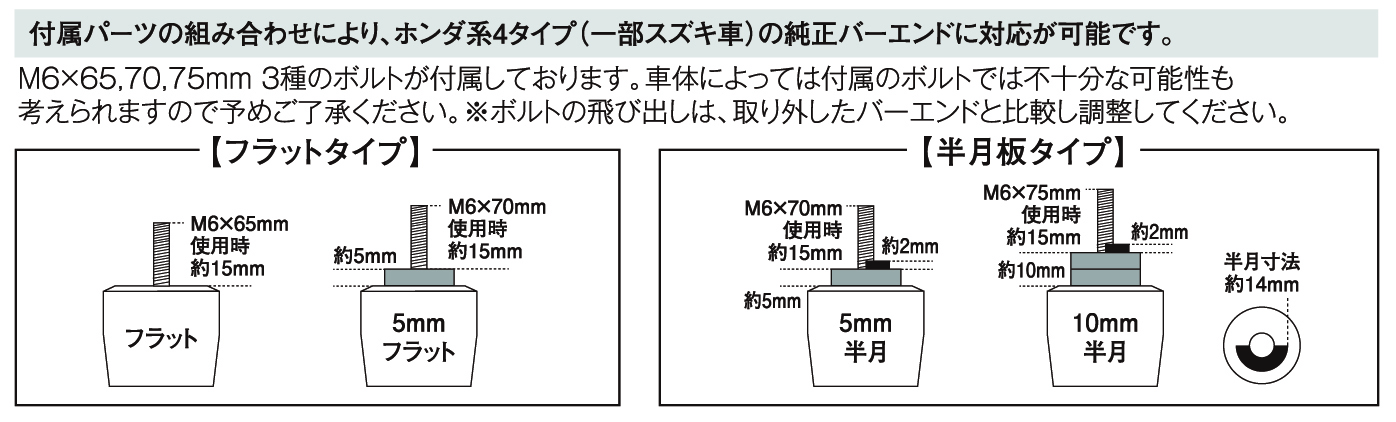 付属パーツの組み合わせにより、ホンダ、スズキ、ヤマハ車の純正バーエンドに対応が可能です。