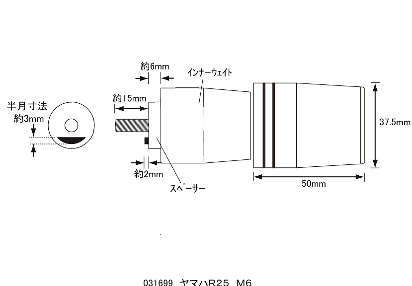 “超!重量級”ウルトラヘビーバーエンド!ヤマハ車純正M6タイプ(純正ハンドルバー用)真鍮製インナーパーツ内蔵の防振ウェイトバランサータイプのバーエンドです。アウターパーツはアルミ製となっていますので車体に合わせてカラーをお選びいただけます。付属パーツの組み合わせにより、ヤマハ車M6タイプの純正ハンドルに対応が可能です。【素材/材質】インナー:真鍮メッキ仕上げアウター:アルミ削り出しアルマイト/メッキ仕上げ【重量】1個あたり約330g【付属品】ヤマハ車専用スペーサー:2個M6×65mmボルト:2本【仕様】・防振ウェイトバランサータイプ・最大外径:37.5mm・日本製※使用するグリップ・車種によってはワッシャー等で調整が必要な場合があります。※ボルトの飛び出しは、取り外したバーエンドと比較し調整してください。※車体によっては付属のボルトでは不十分な可能性も考えられますので予めご了承ください。※取り付けの際、脱落防止の為、ネジロック剤の塗布を推奨致します。【適合参考車種】YZF-R25(2015-2021)YZF-R3(2015-2021)MT-25(2016-2020)MT-03(2016-2020)N-MAX(2017-2020)
